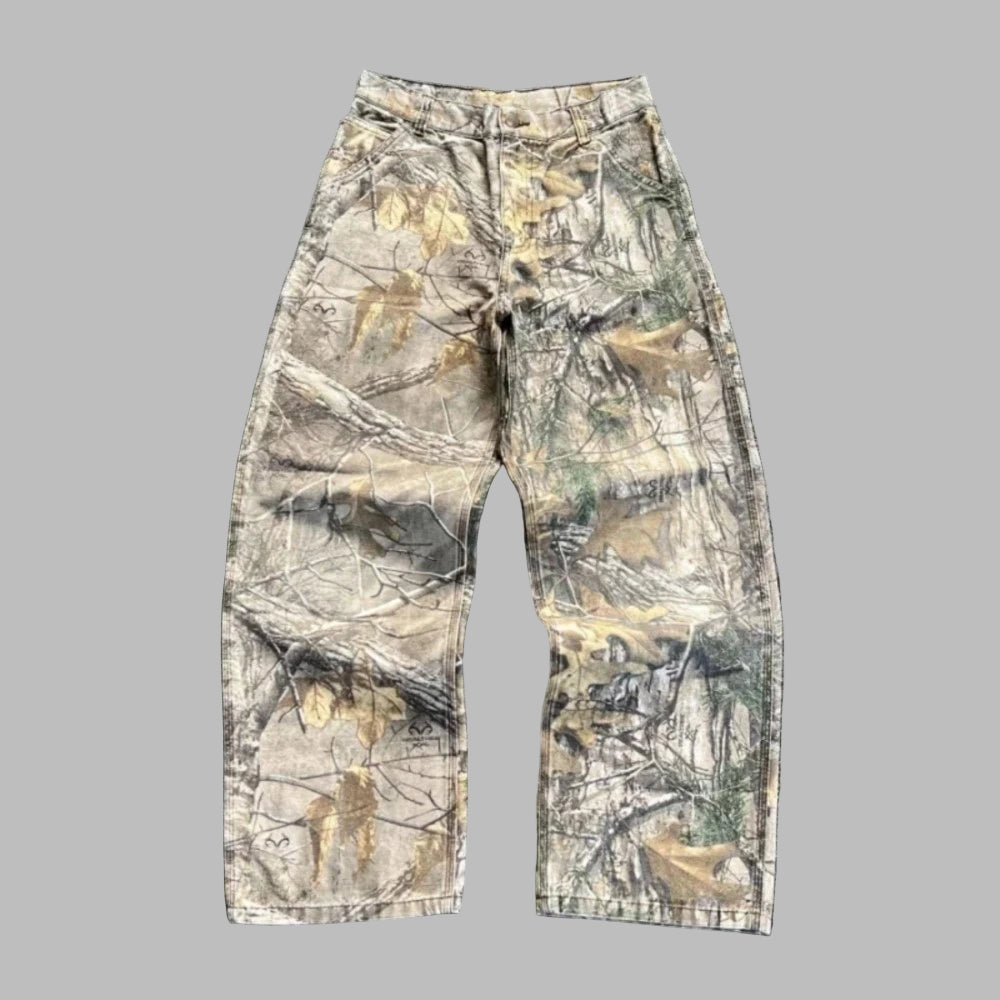 Beige Cargo-Hose mit Blatt-Tarnmuster Techwear