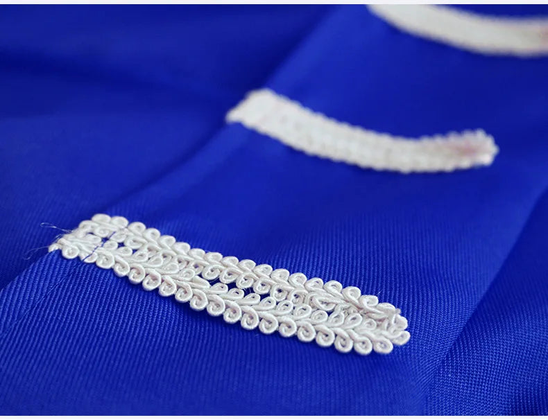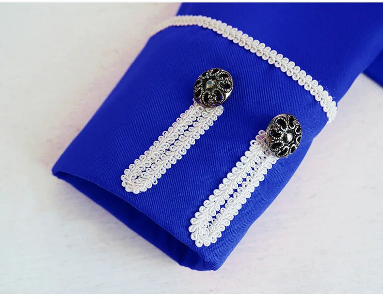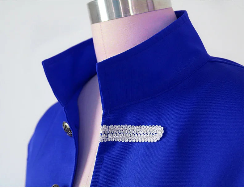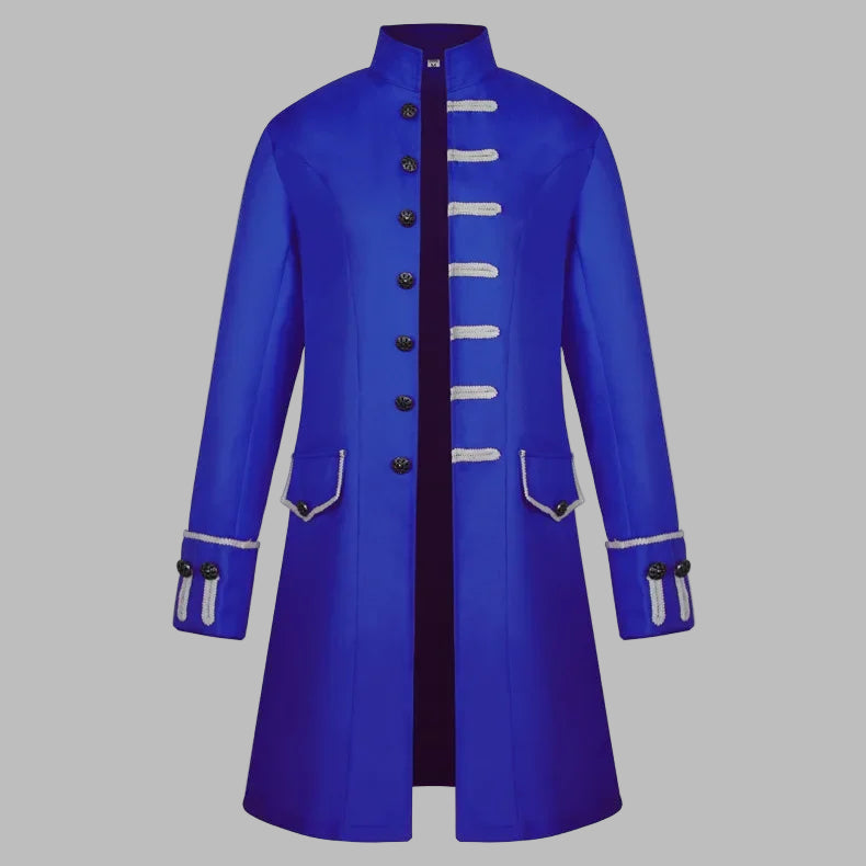 Blauer Herren-Steampunk-Mantel mit weißen Zierkordeln