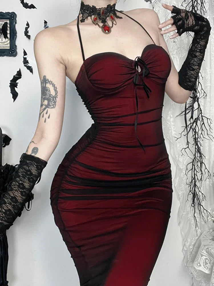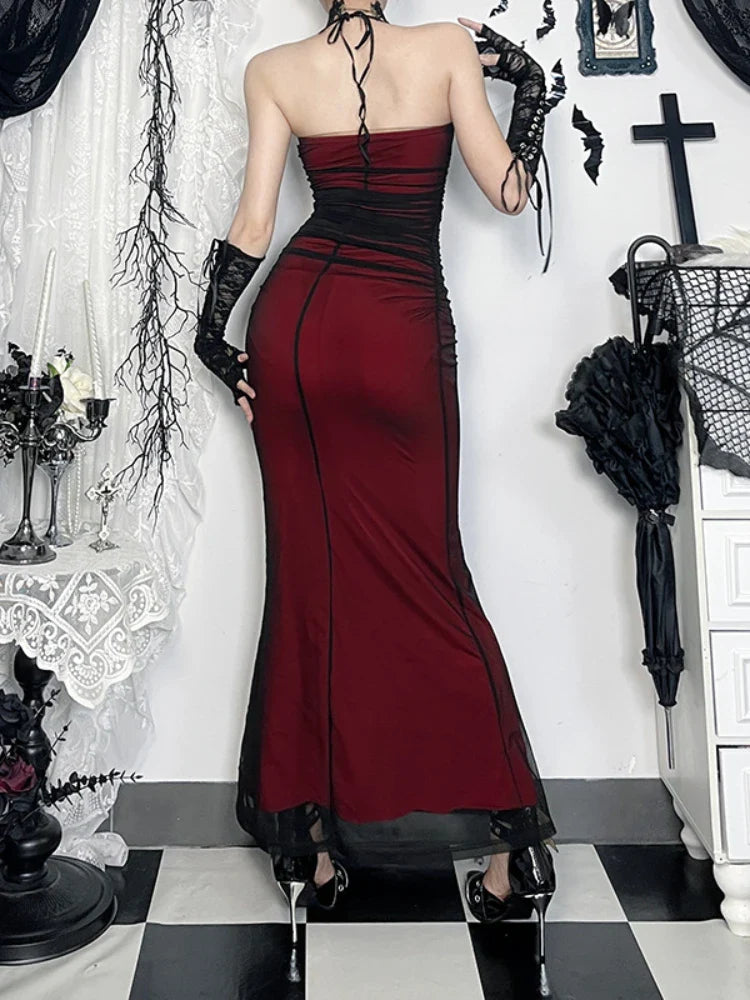Bordeauxfarbenes langes Gothic-Mermaid-Kleid mit Schlitz und Spitze