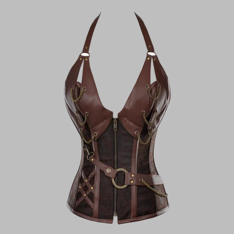 Braunes Steampunk-Korsett mit Ketten und Lederriemen