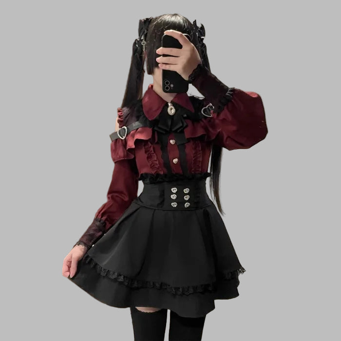 Burgunder Bluse und Rock im Gothic Punk Rock Stil mit schwarzem Korsett