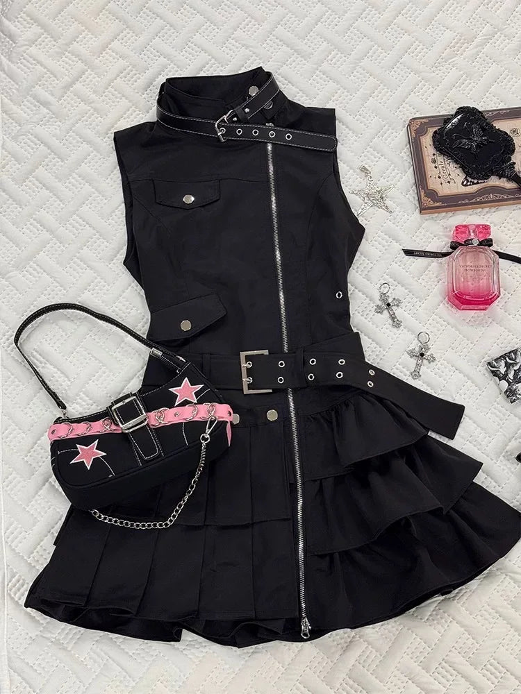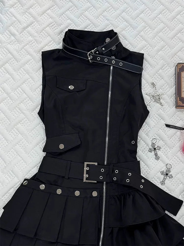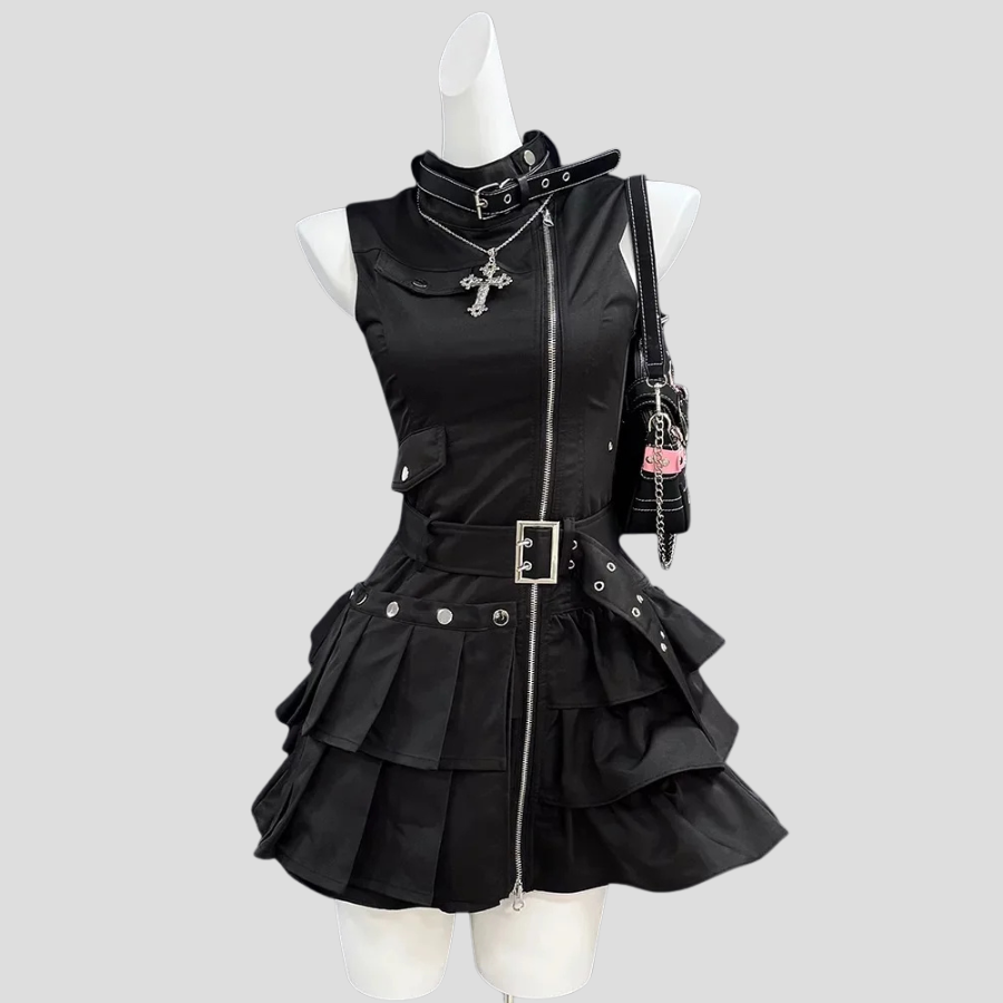 Gothic Kleid Schwarz Streifen Reißverschluss Rüschen Damen