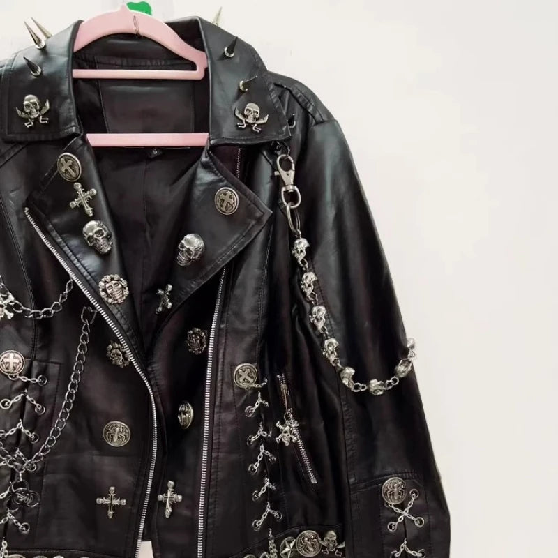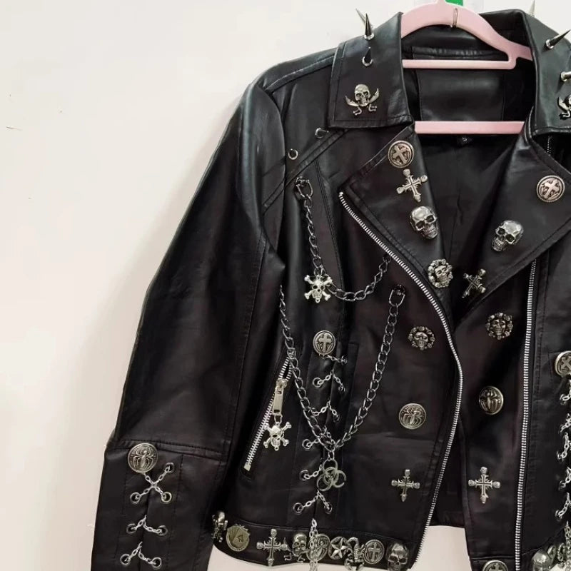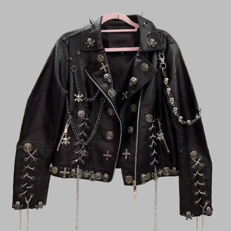 Damen Gothic Lederjacke Schwarz mit Nieten Ketten Kreuzen