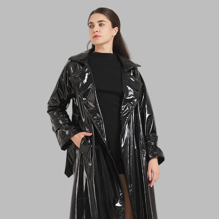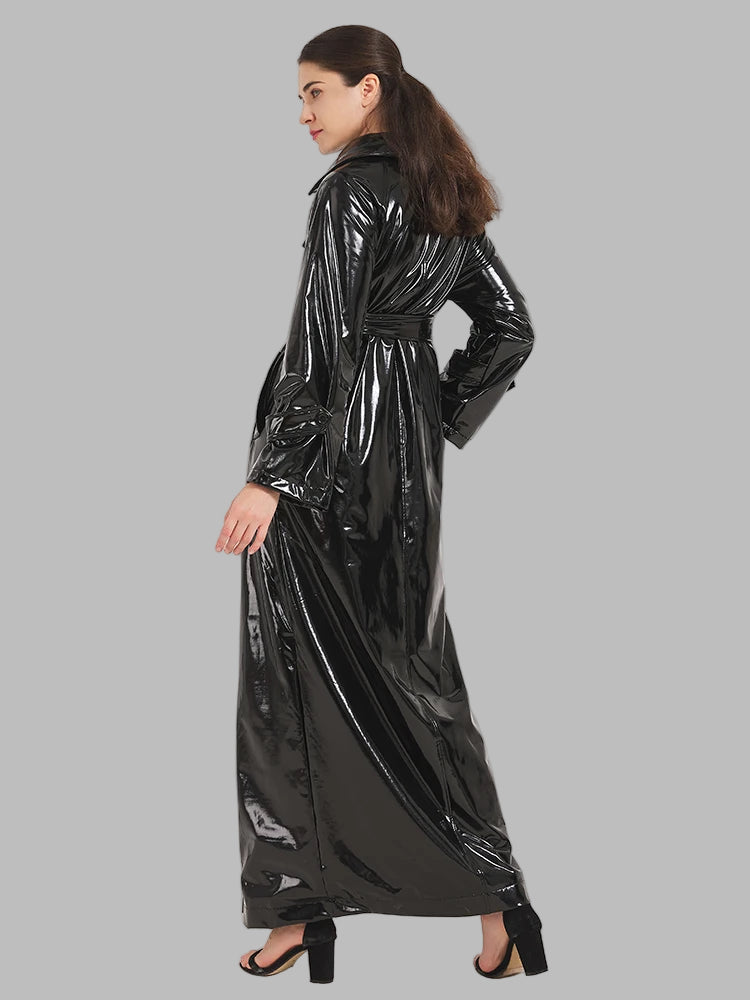 Langer schwarzer lackierter Damen-Gothic-Ledermantel