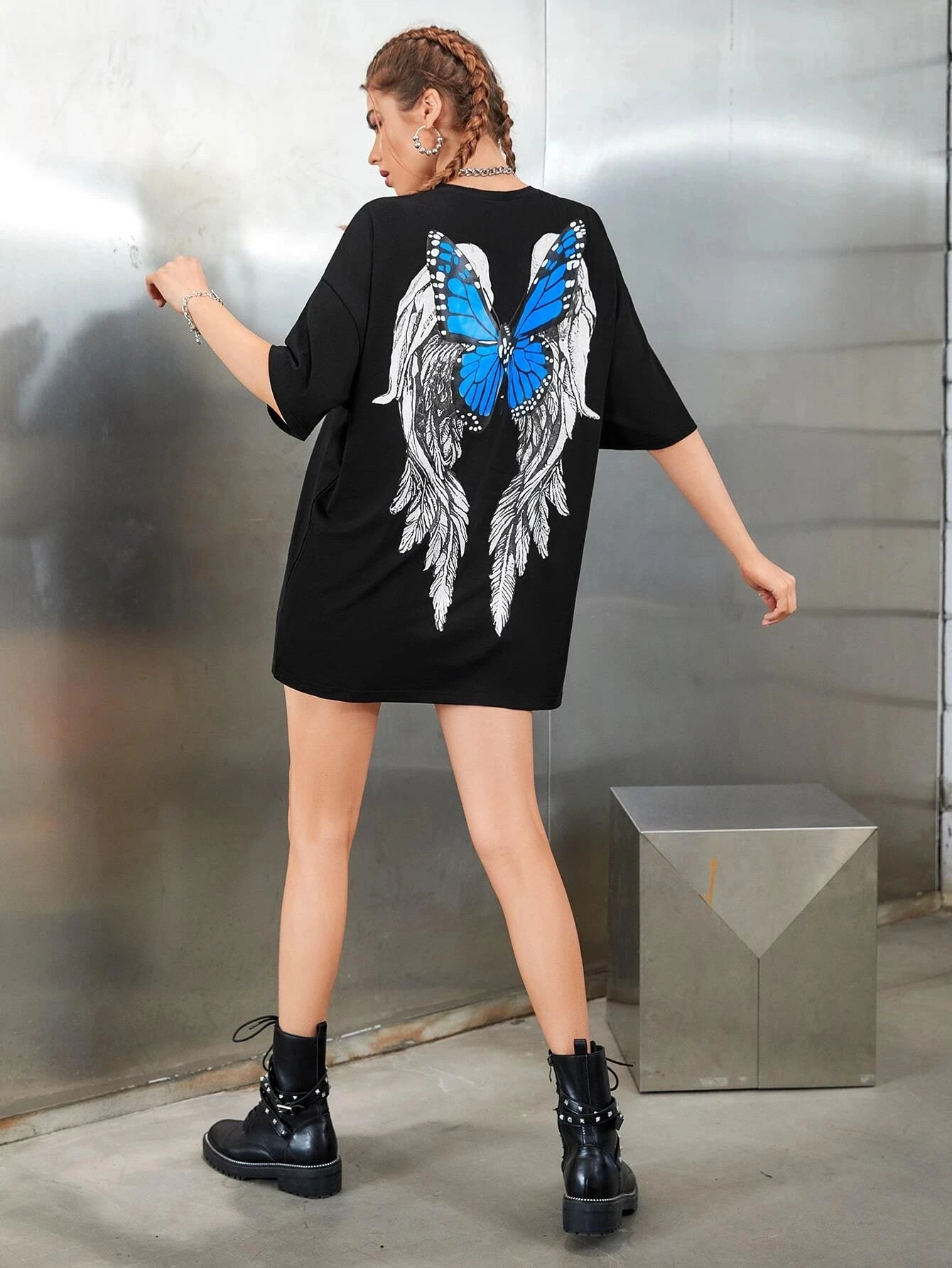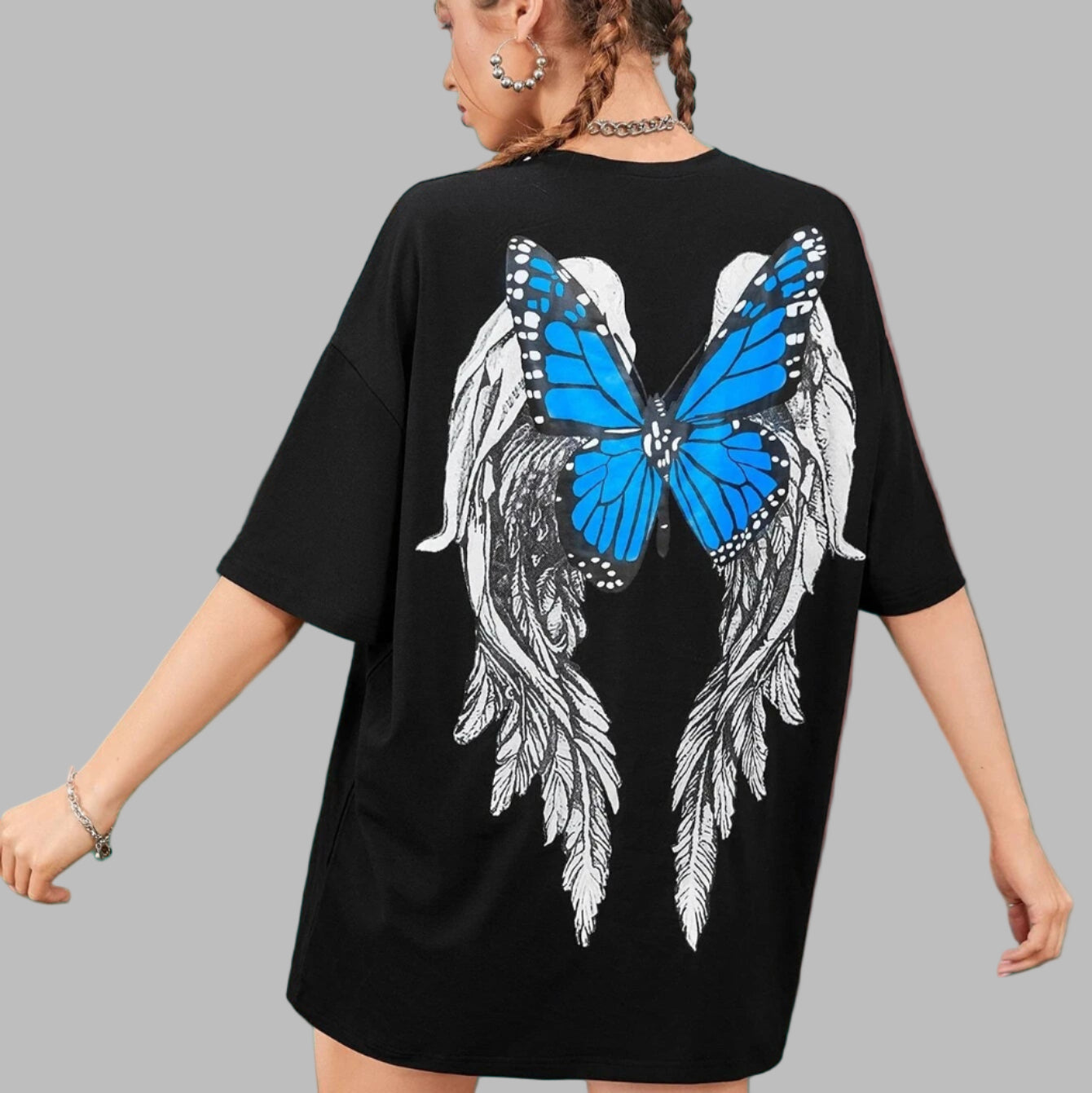 Damen Oversize Gothic Rock Bluse mit blauen Schmetterlingsflügeln