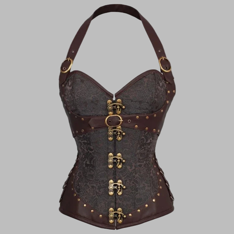 Damen Steampunk Korsett Braun mit Glitzer-Muster und Metallschnallen