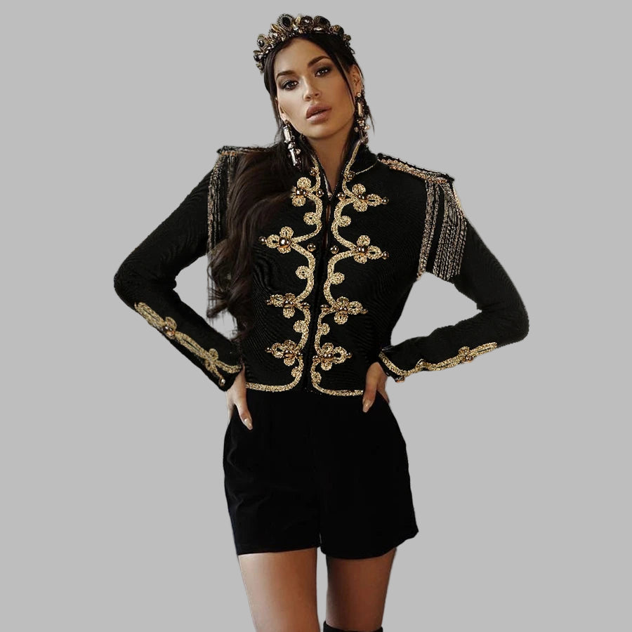 Damen Vintage Steampunk Blazer Schwarz mit Goldstickerei im Militärstil