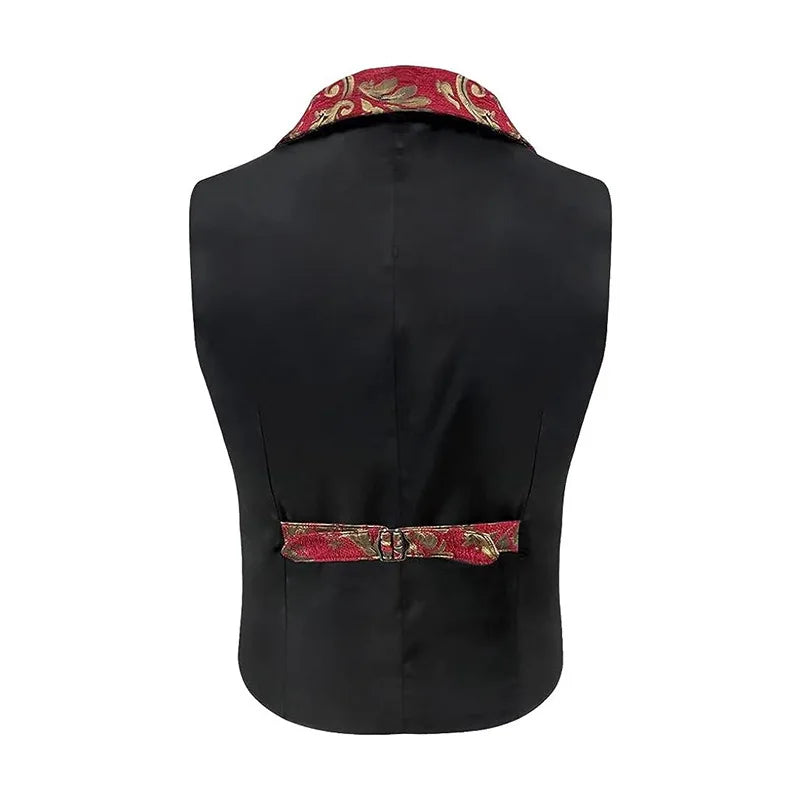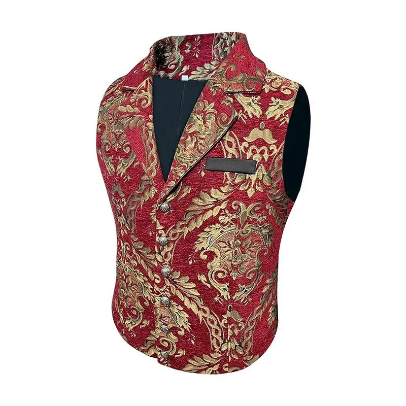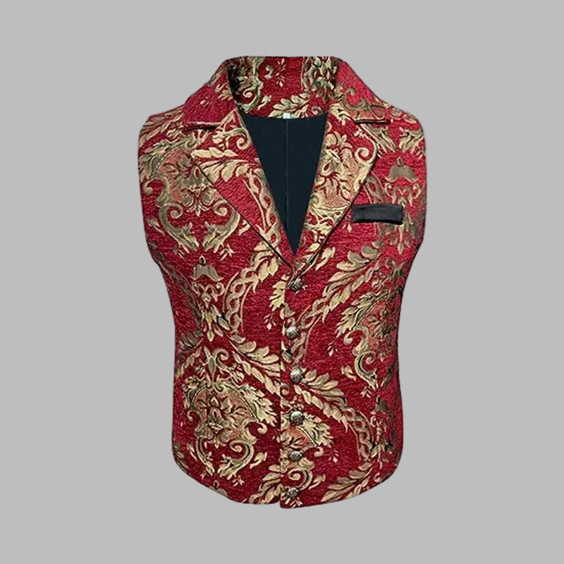 Elegante Steampunk-Weste aus rotem und goldenem Brokat