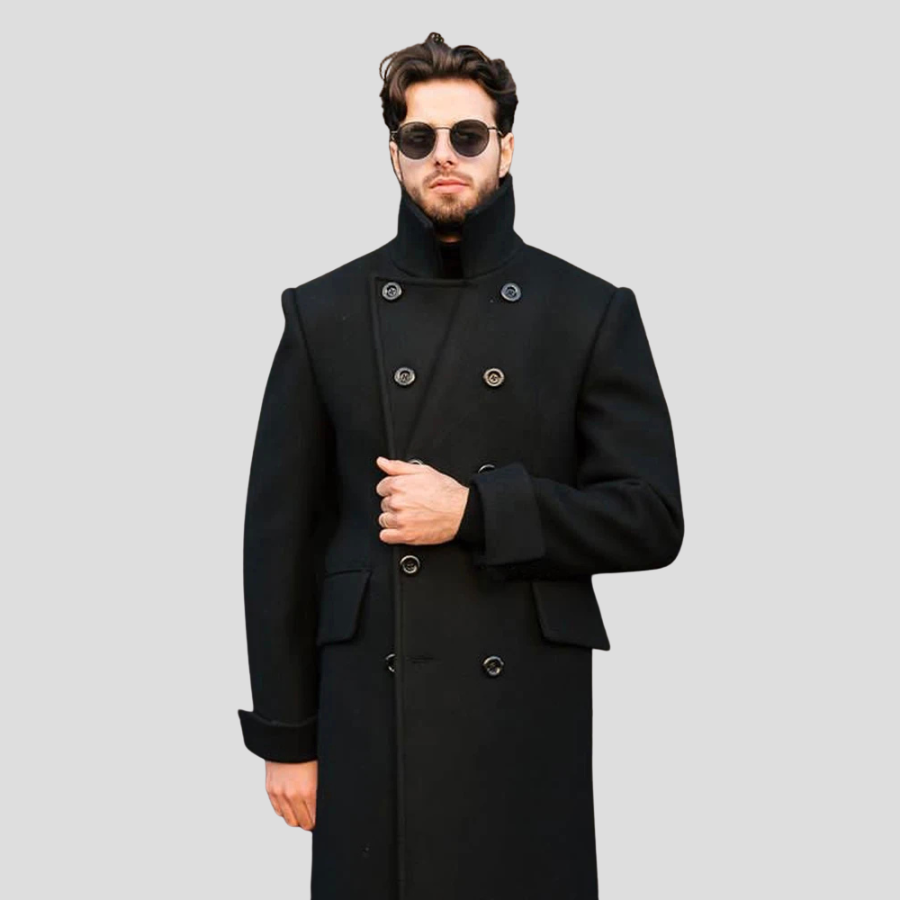 Eleganter langer schwarzer Steampunk-Mantel mit doppelter Knopfleiste und Metallelementen