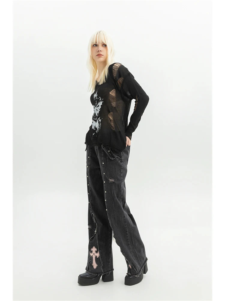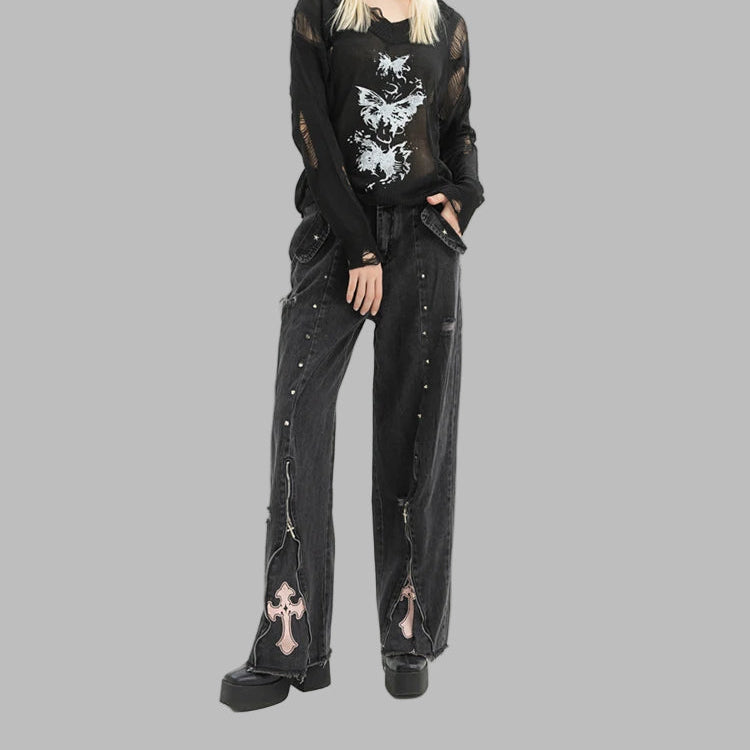 Gotische Punk-Denim-Hose mit Kreuzen und Nieten, Weit