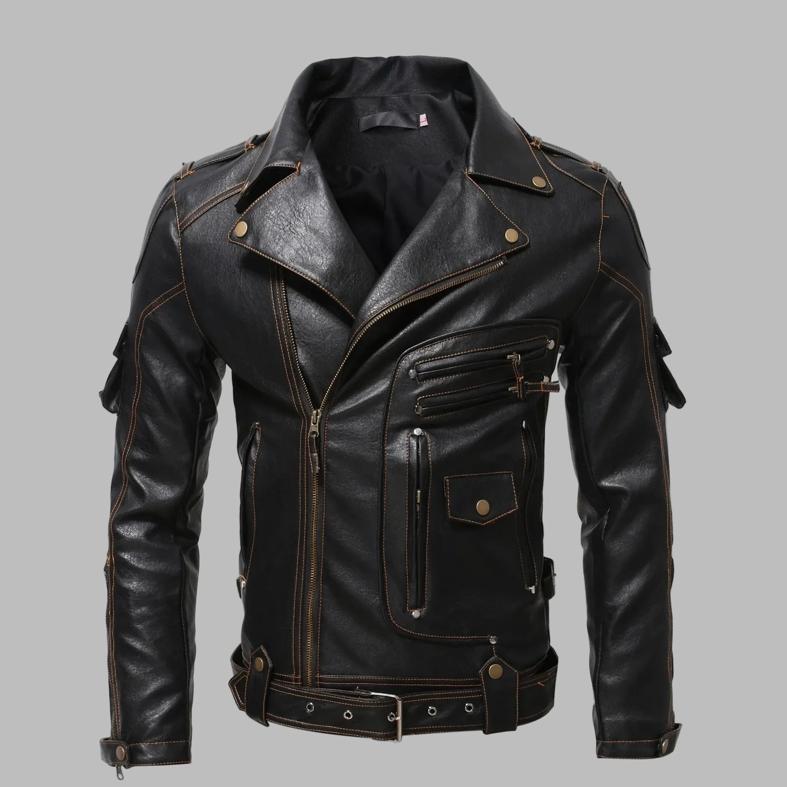 Schwarze Herrenlederjacke mit Nieten und Riemen im Goth-Punk-Motorradstil