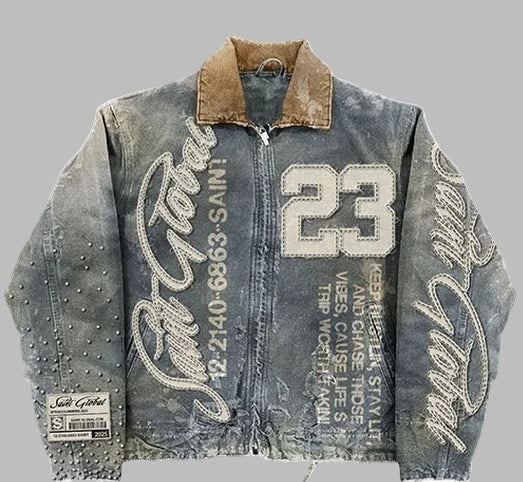 Jeansjacke im Rock-Grunge-Metal-Stil mit Schriftzügen und Vintage-Nieten
