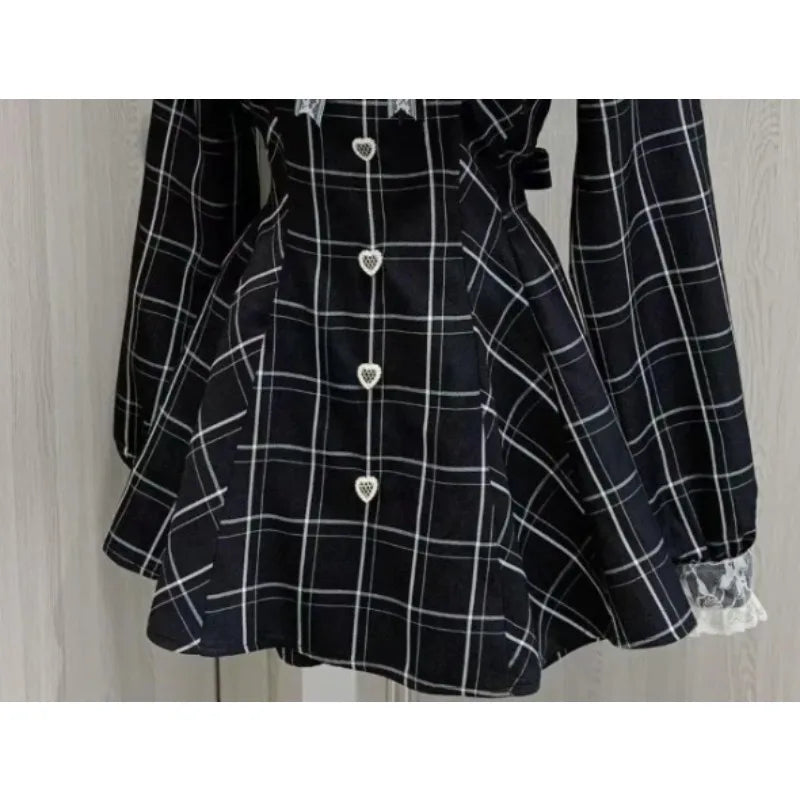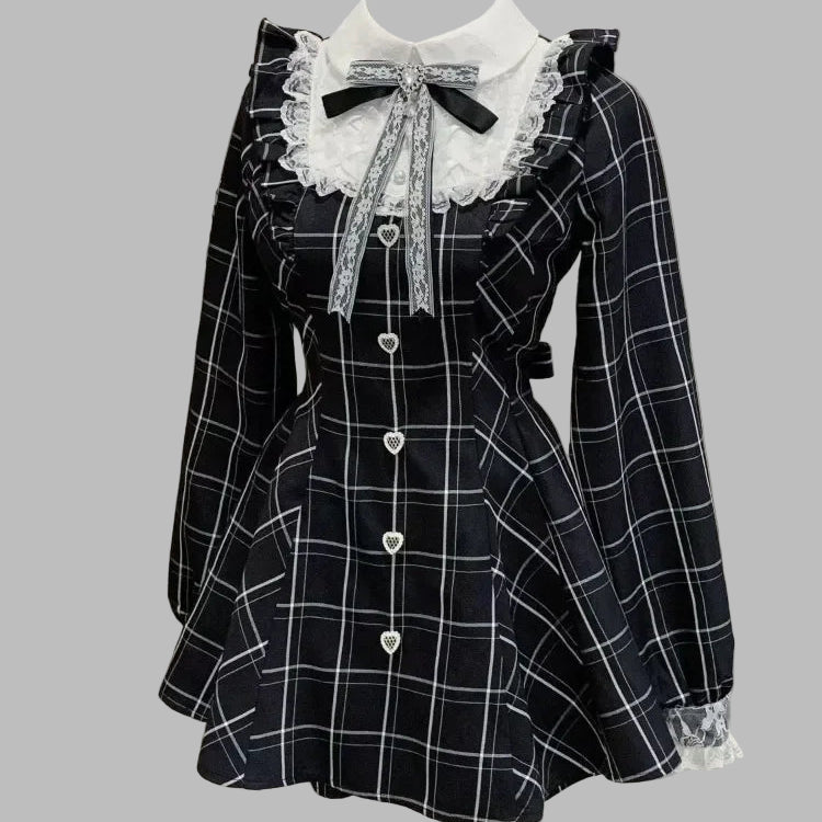 Jirai Kei Kariertes Kleid Schwarz mit Spitzenjabot