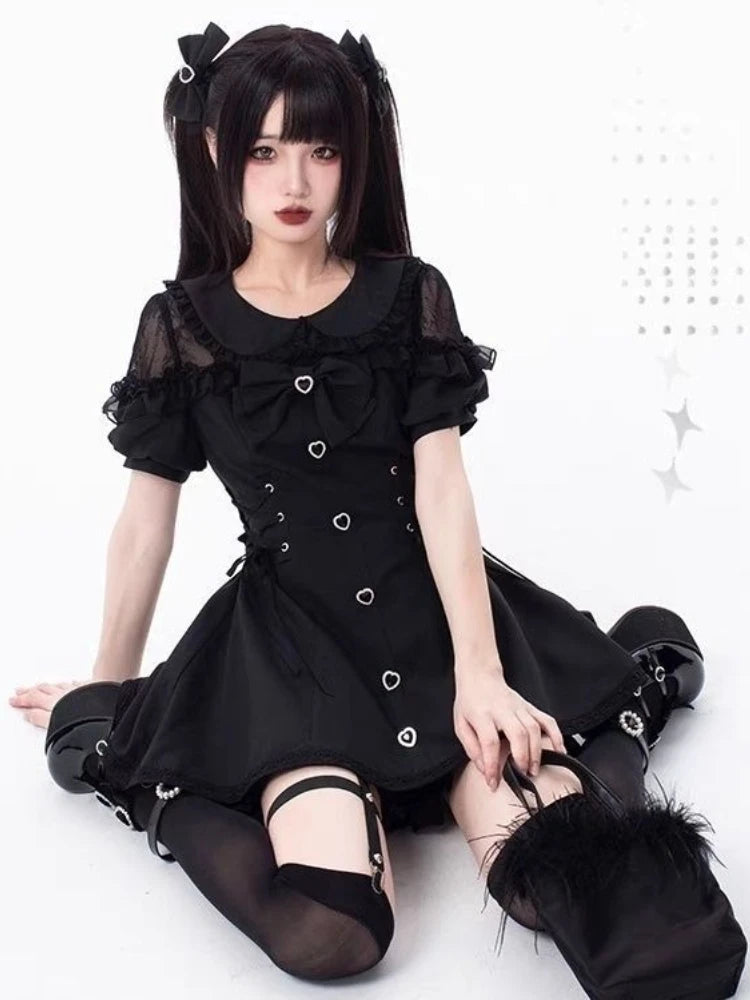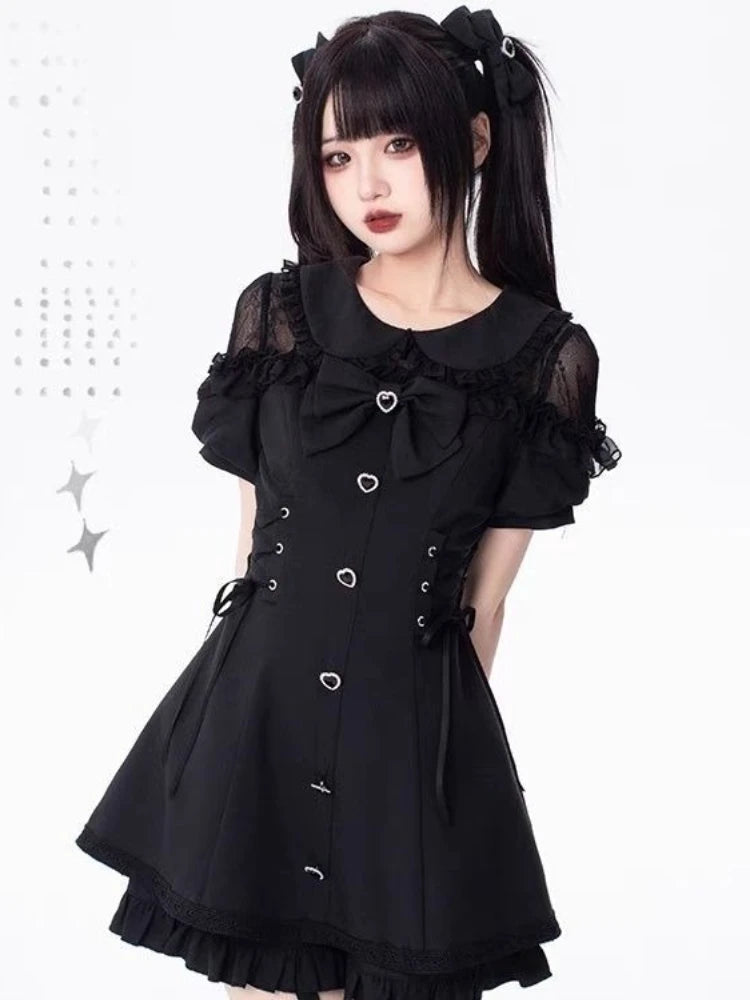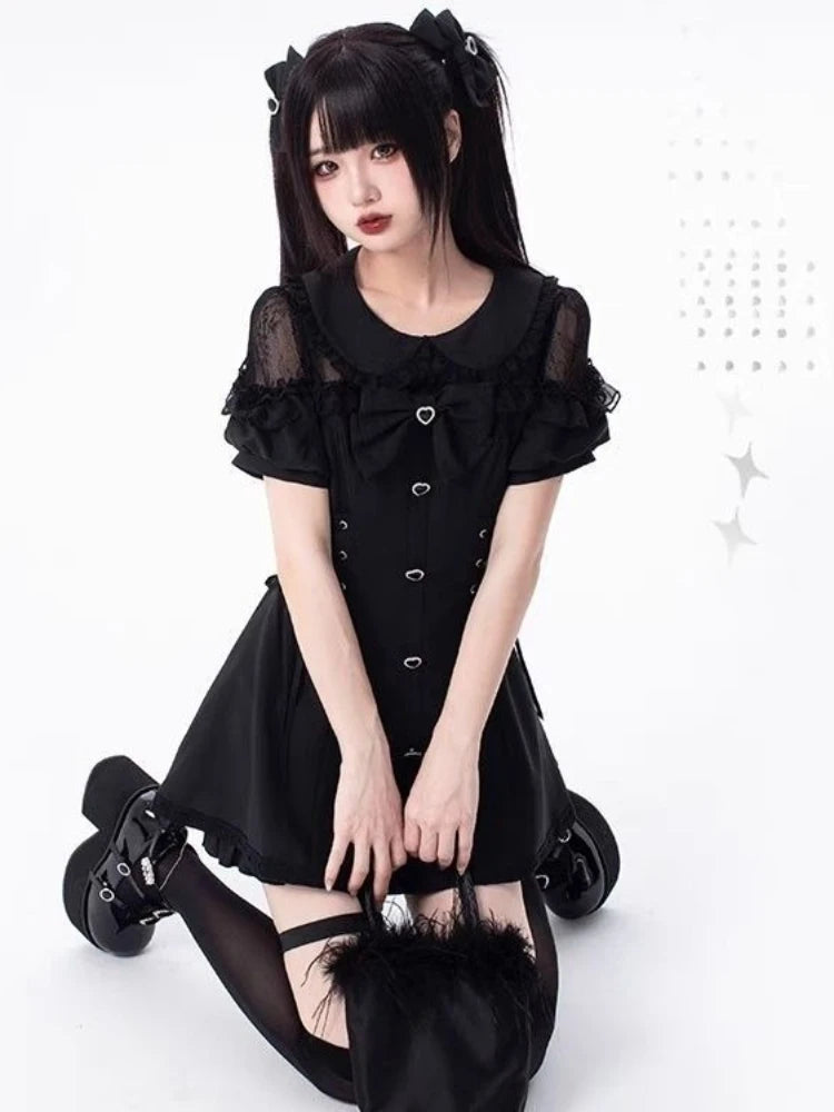 Jirai Kei Kleid mit Herzknöpfen Schwarzes Rüschenkleid
