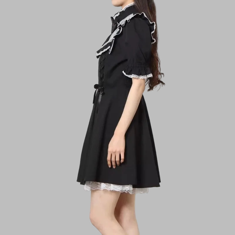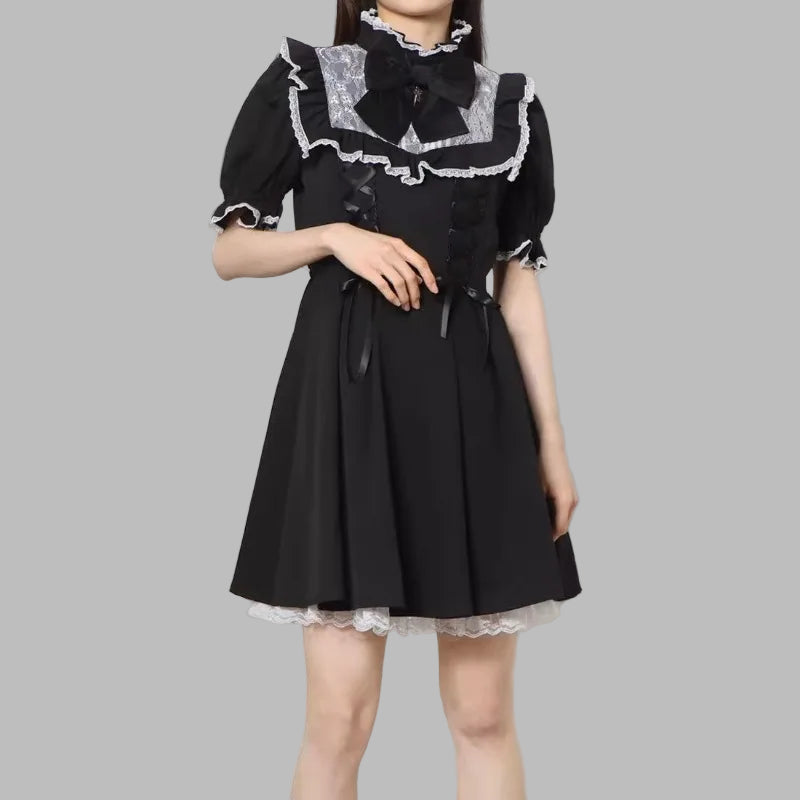 Jirai Kei Kleid mit Spitzenband und Schnürung Schwarz