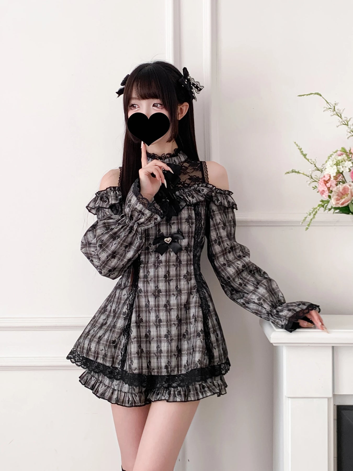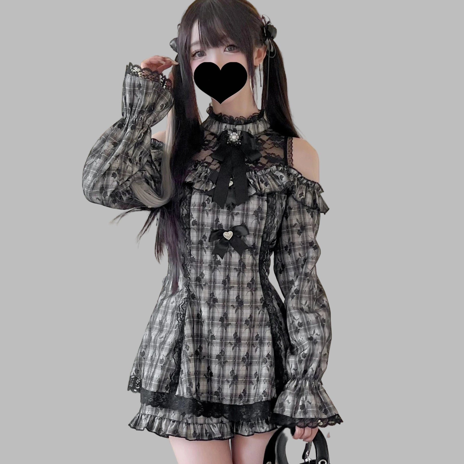Jirai Kei Schulterfreies Kleid mit Spitze in Grau Kariert