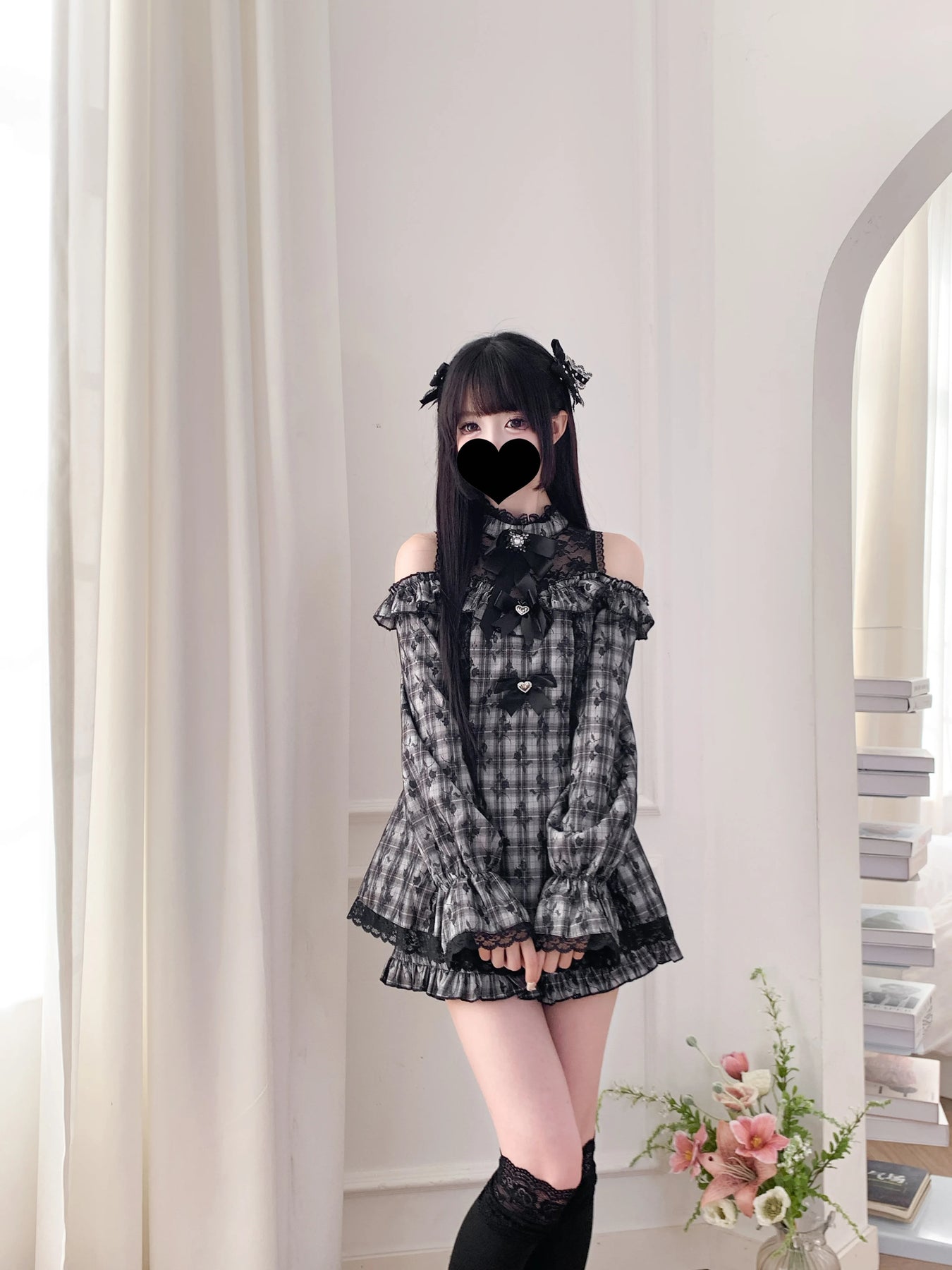 Jirai Kei Schulterfreies Karo-Kleid mit Spitze Grau Optionen anzeigen