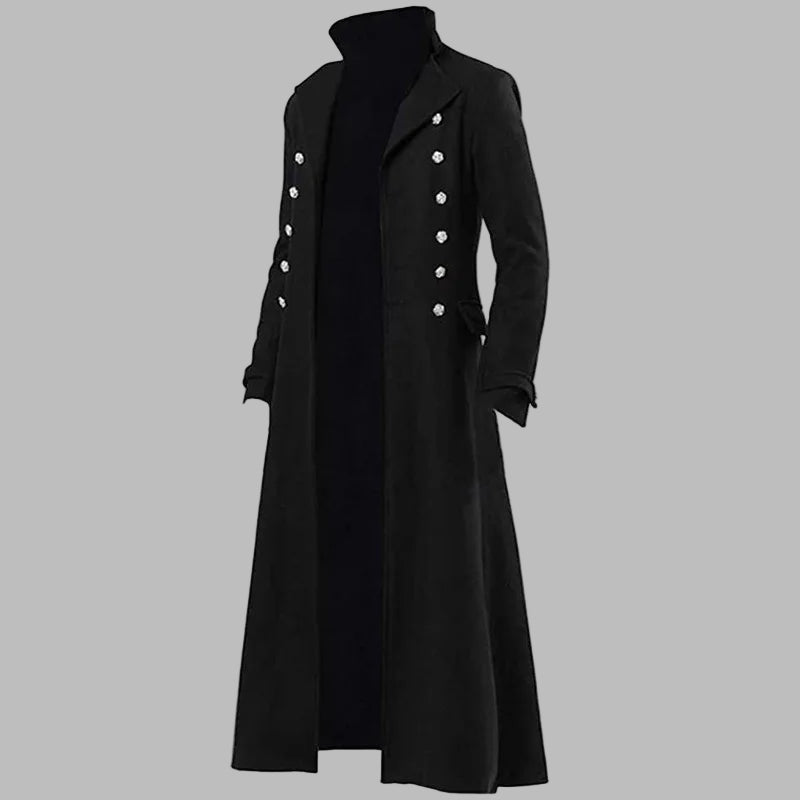 Langer schwarzer Goth-Rock-Mantel mit eleganten Metallknöpfen