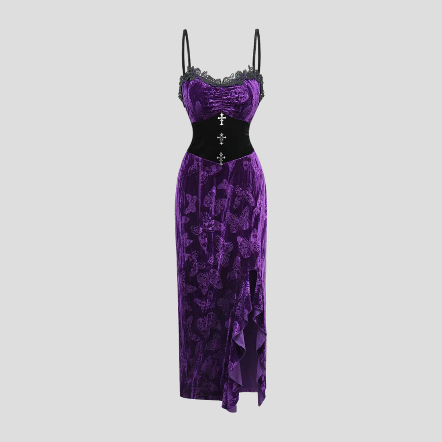 Langes gothic violettes Samtkleid mit Spitze und Kreuzen