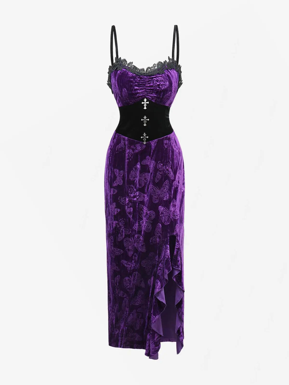 Langes gothic violettes Samtkleid mit Spitze und Kreuzen Optionen anzeigen