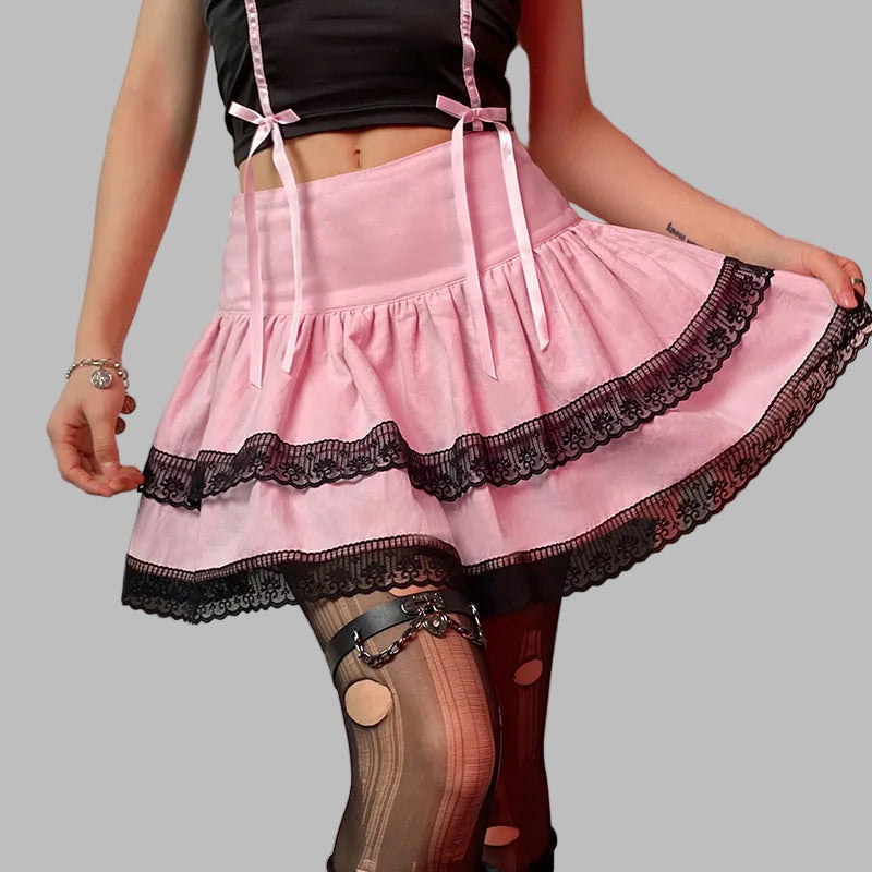 Rosa Punk Jirai Kei Rock mit schwarzer Spitze und Rüschen