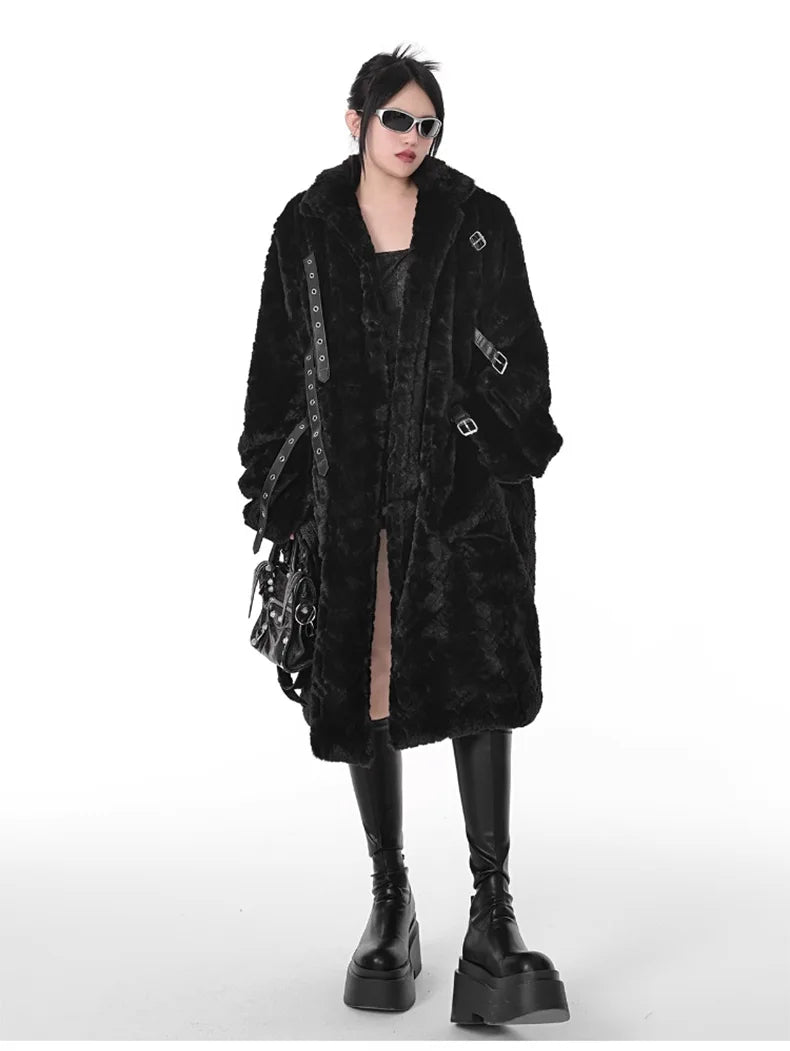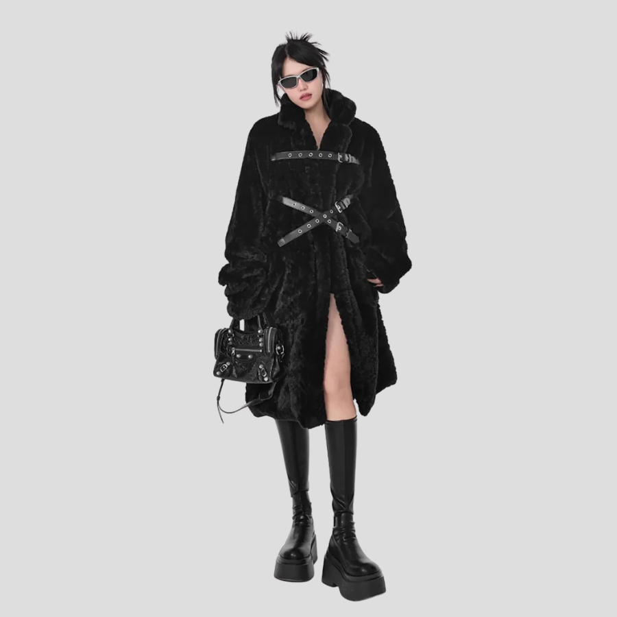 Langer schwarzer Punk-Mantel mit Fell und Riemen
