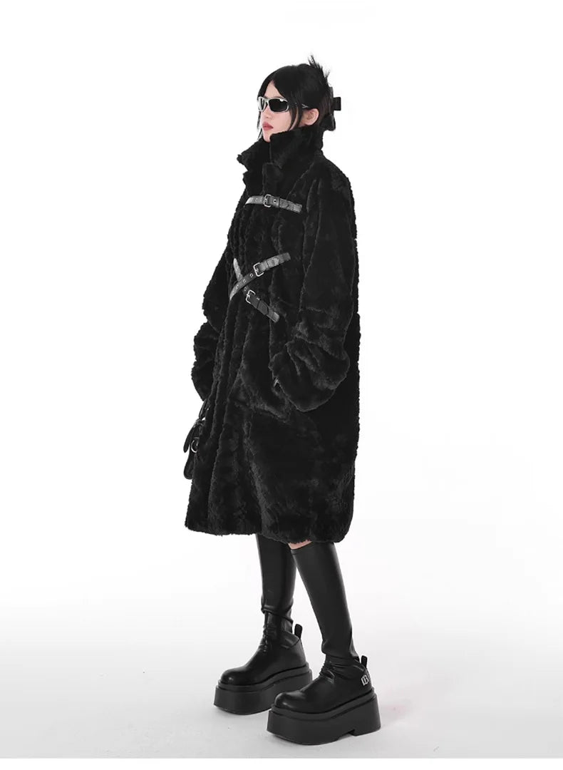 Schwarzer Punk-Mantel mit Riemen und langem Kunstfell