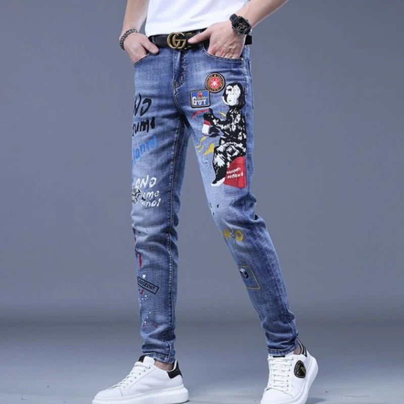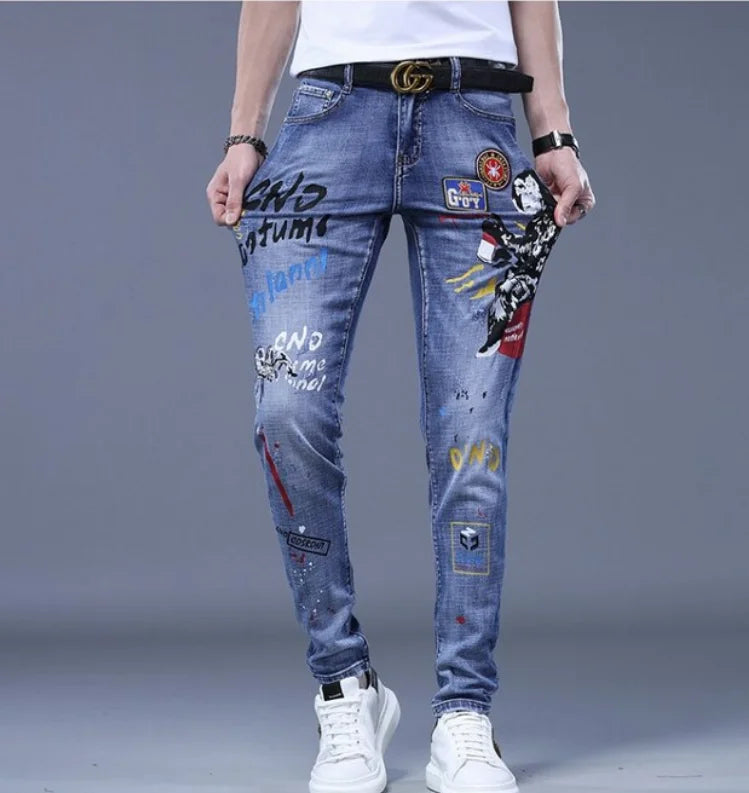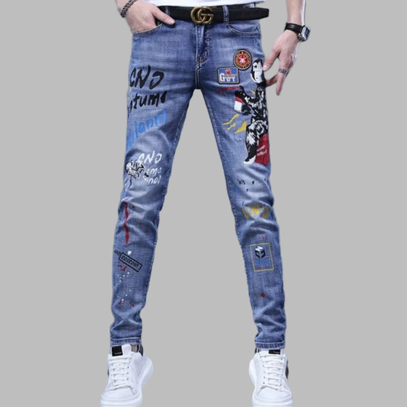 Blaue Punk-Rock-Jeans mit Aufnähern und Schriftzügen