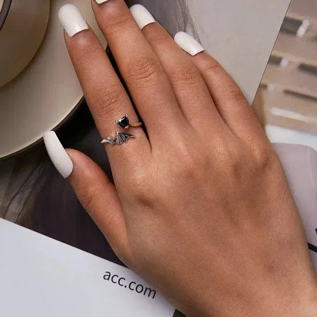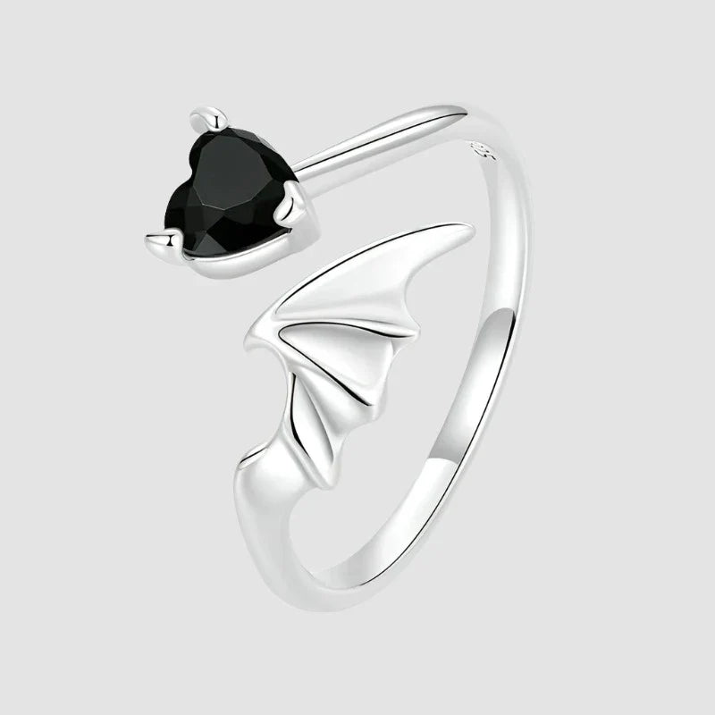 Ring mit schwarzem Flügel und Herz, 925er Silber