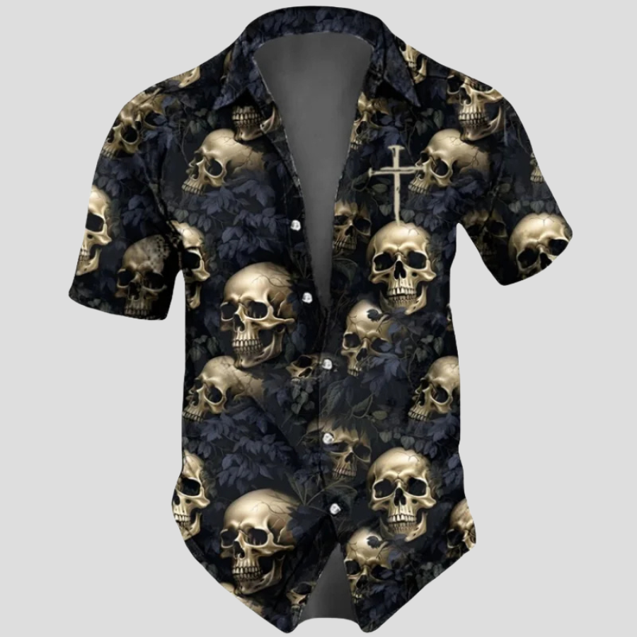 Rock-Hemd mit Goldenen Totenköpfen und Rosen Kurzarm