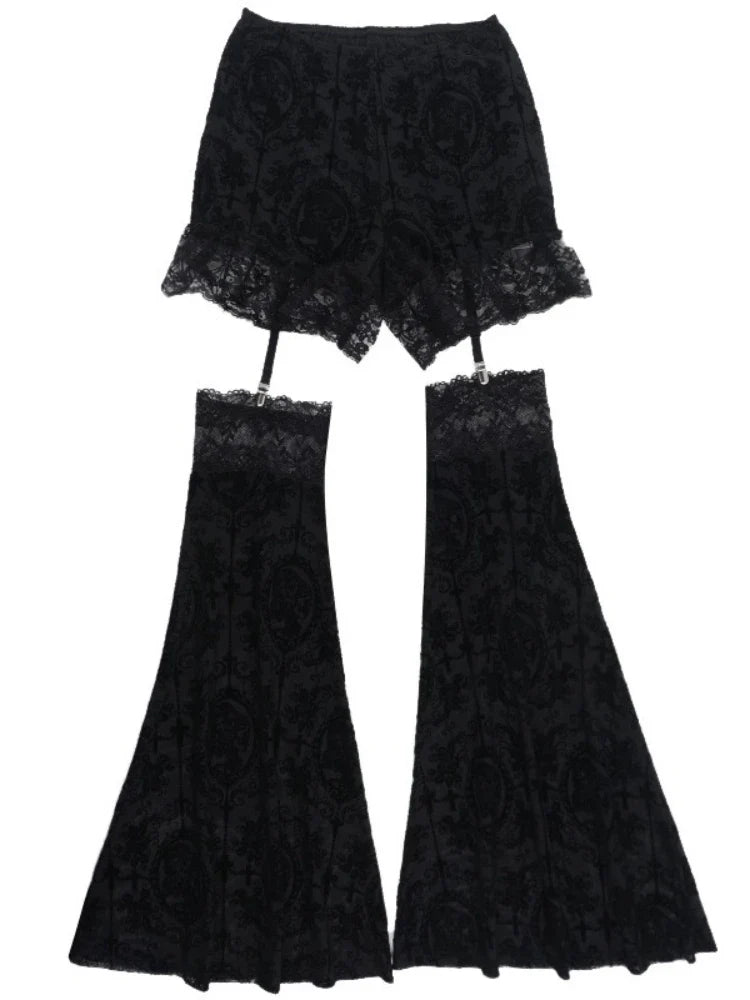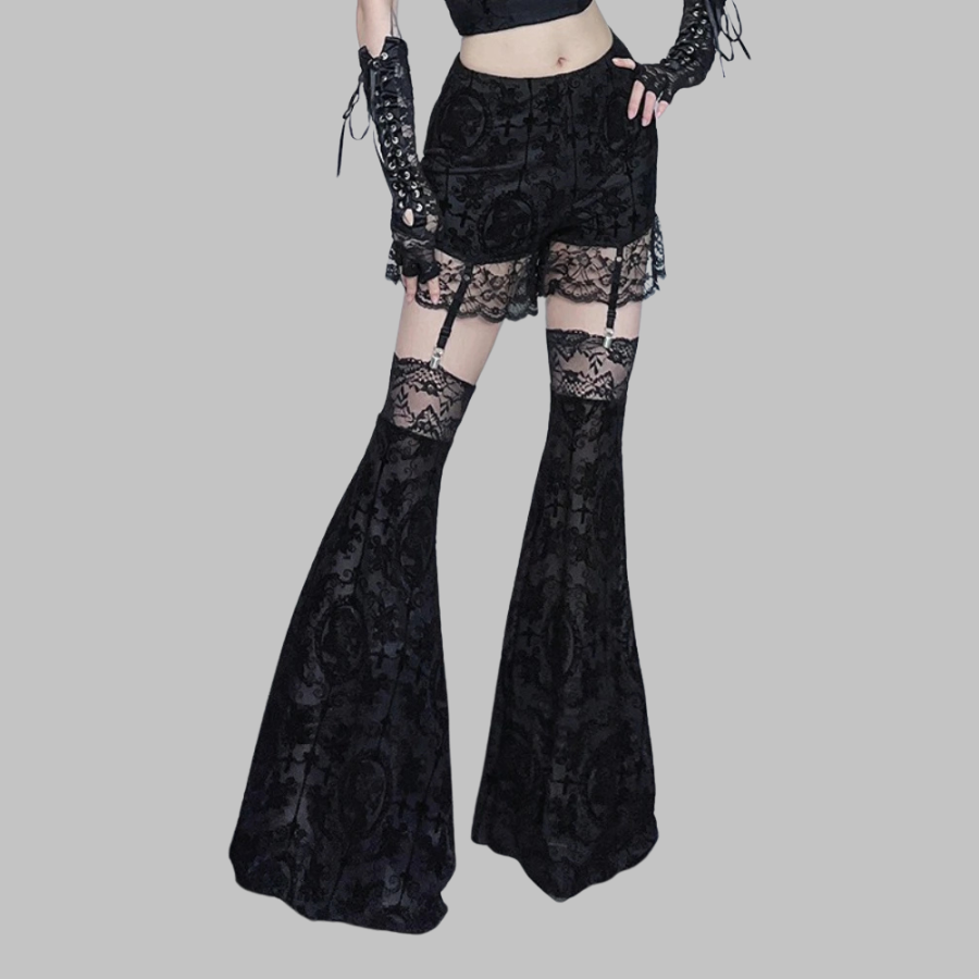 Schwarze gotische Schlaghosen aus Spitze mit kurzem Rock