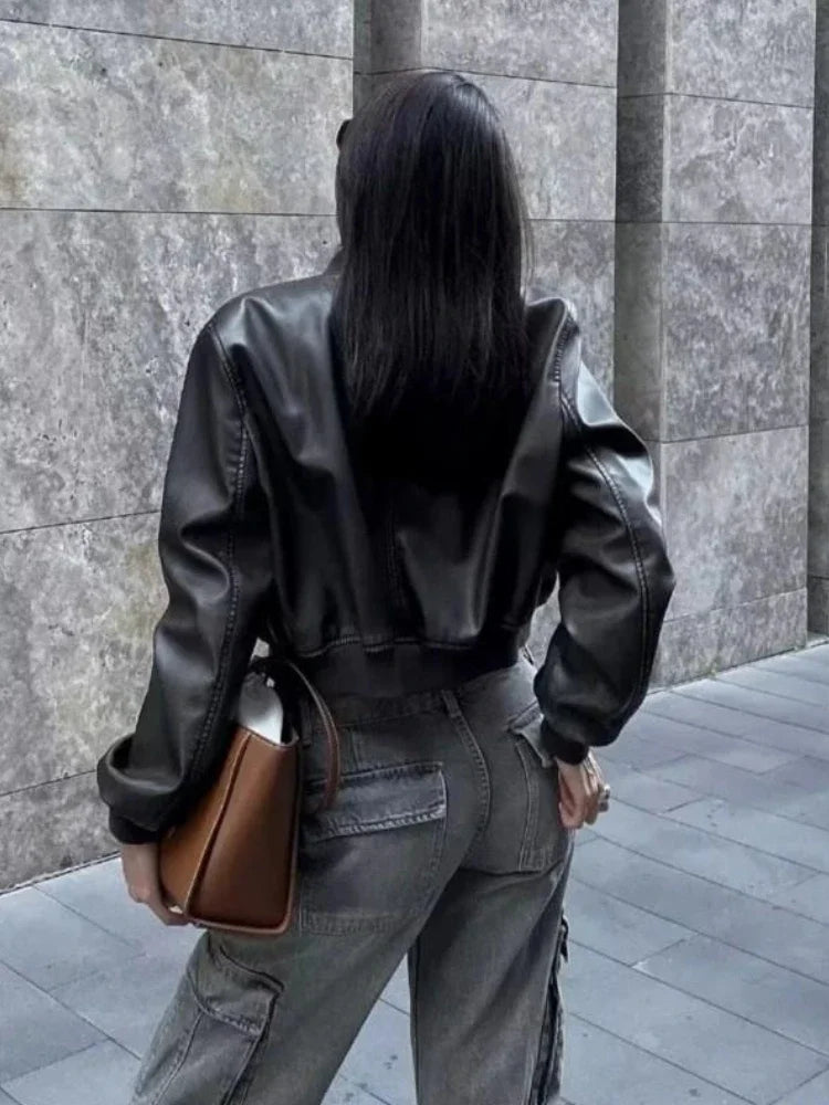 Schwarze kurze Damen-Lederjacke im Rock-Goth-Stil mit Reißverschlüssen