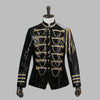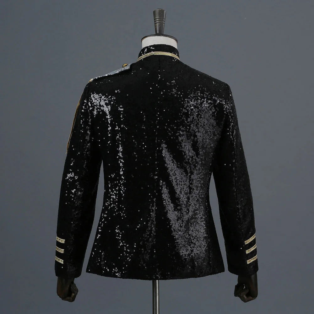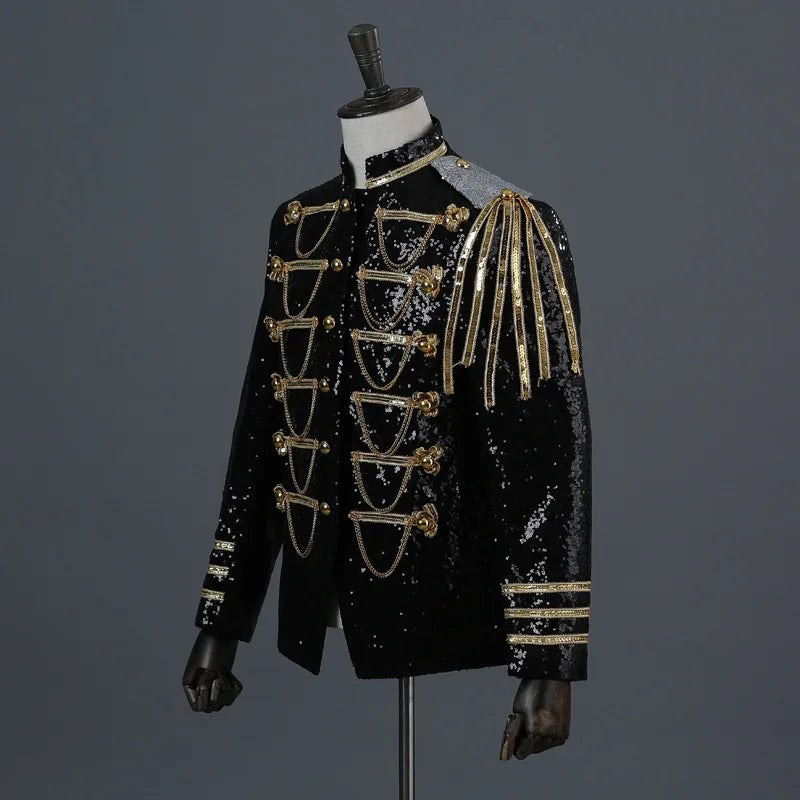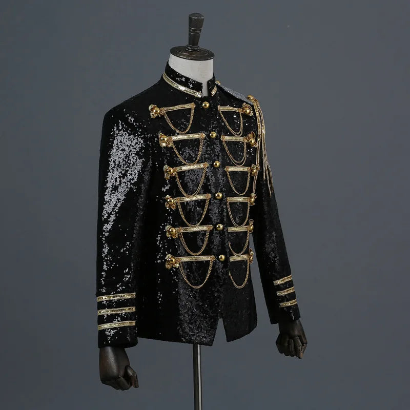 Schwarze Paillettenjacke im Metal-Stil mit Ketten und goldenen Details