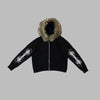 Schwarze Punkjacke mit Fellkapuze und Metallmustern