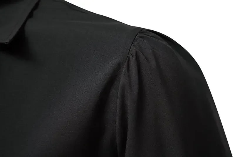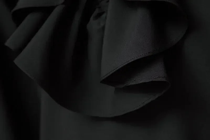 Schwarze Rockbluse mit Spitzenmanschetten und Jabot