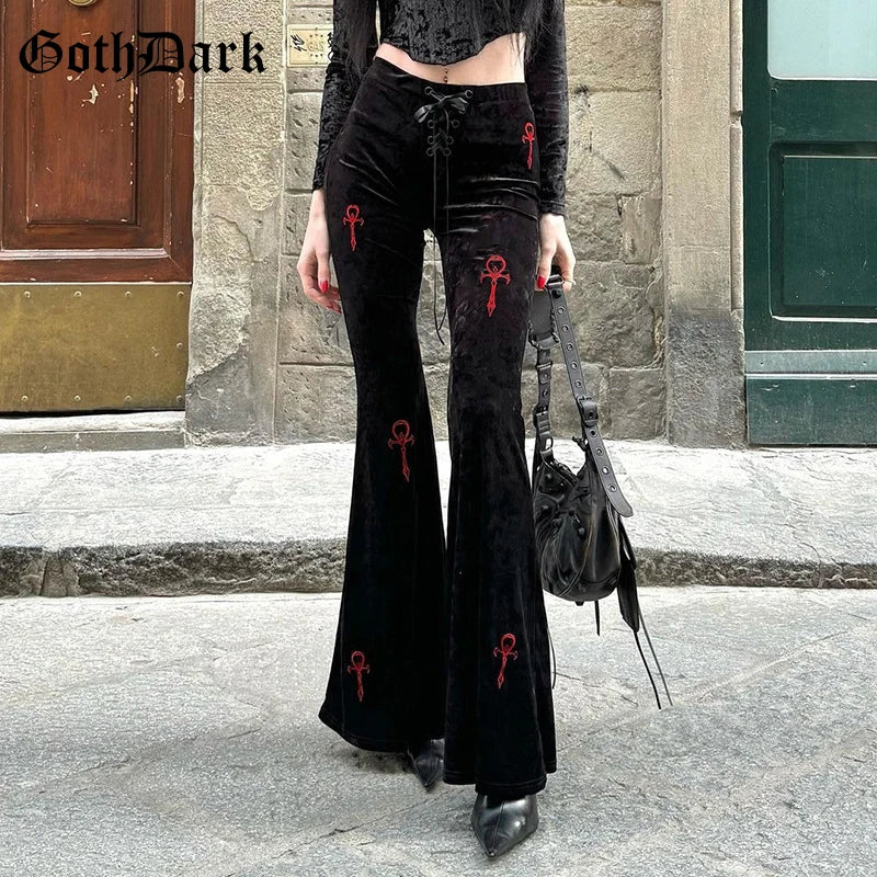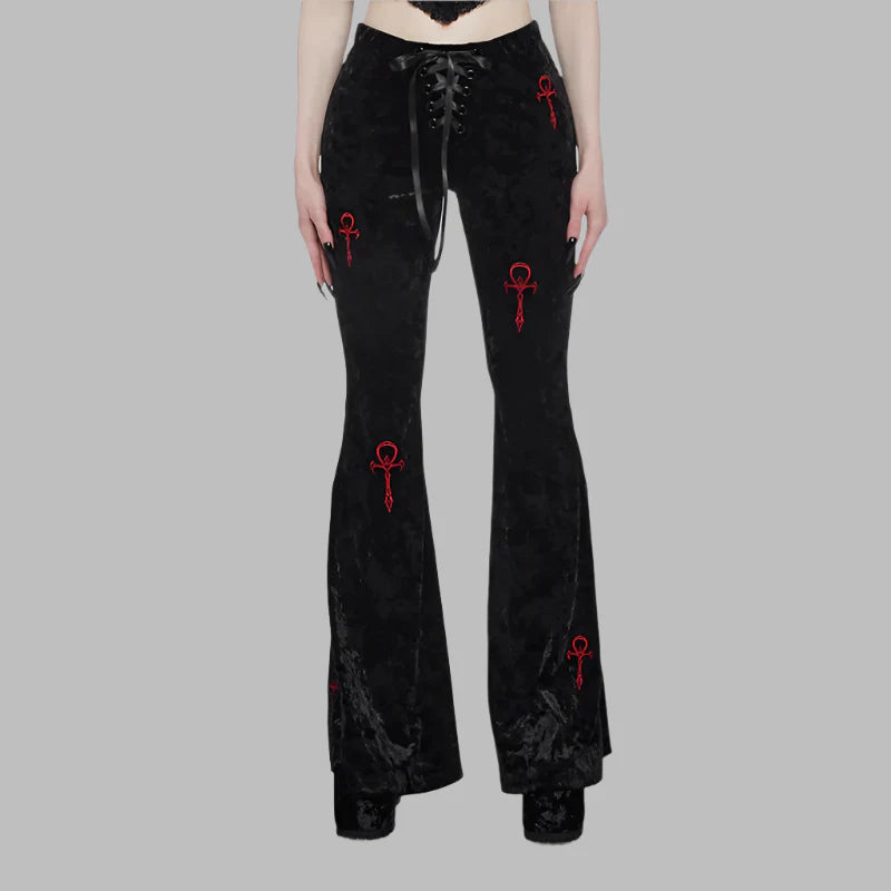 Schwarze Samt-Gothic-Hose mit hohem Bund und roten gestickten Kreuzen Optionen anzeigen