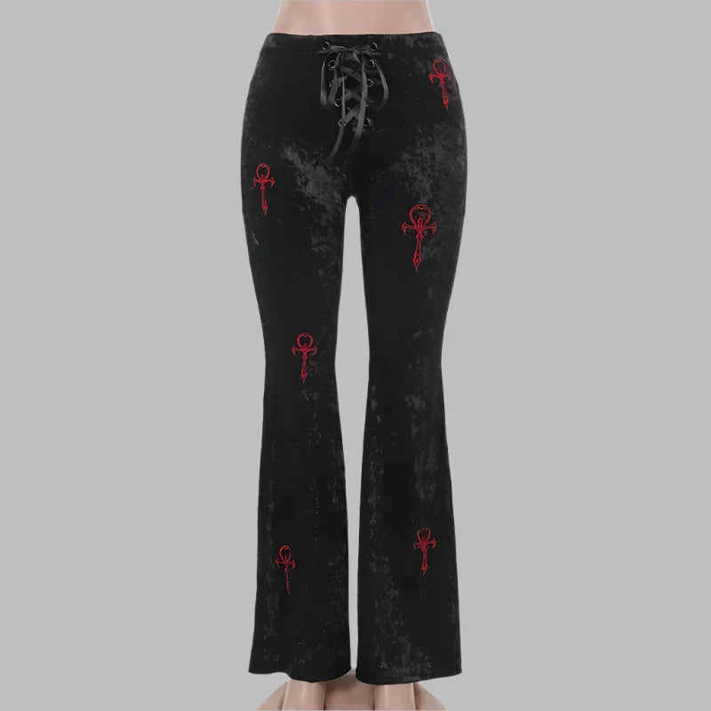 Schwarze Samt-Gothic-Hose mit hohem Bund und roten gestickten Kreuzen