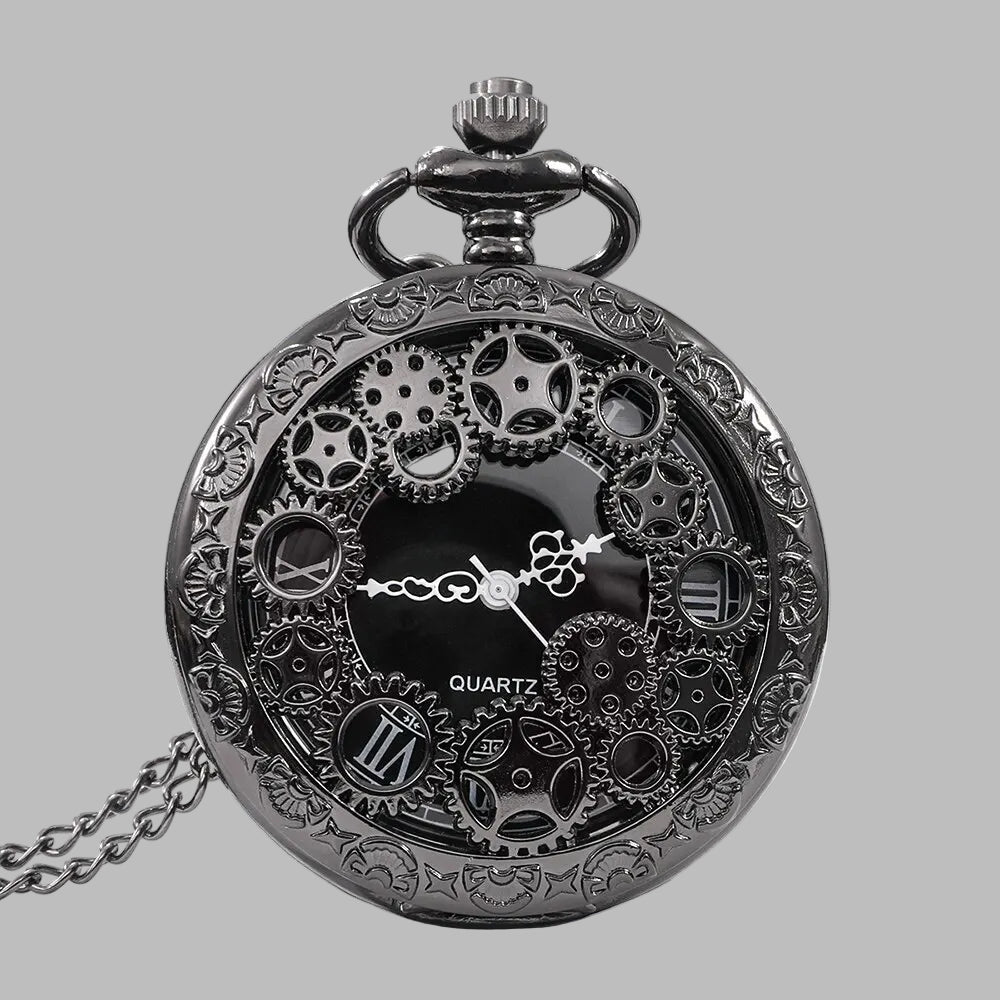 Schwarze Steampunk-Taschenuhr mit mechanischen Zahnrädern