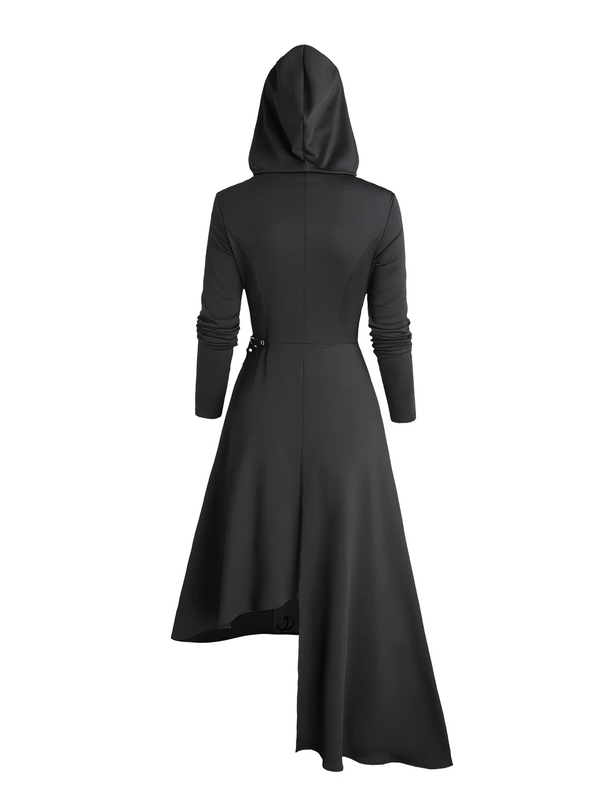 Schwarzer asymmetrischer langer Mantel mit Kapuze und Gürtel Optionen anzeigen