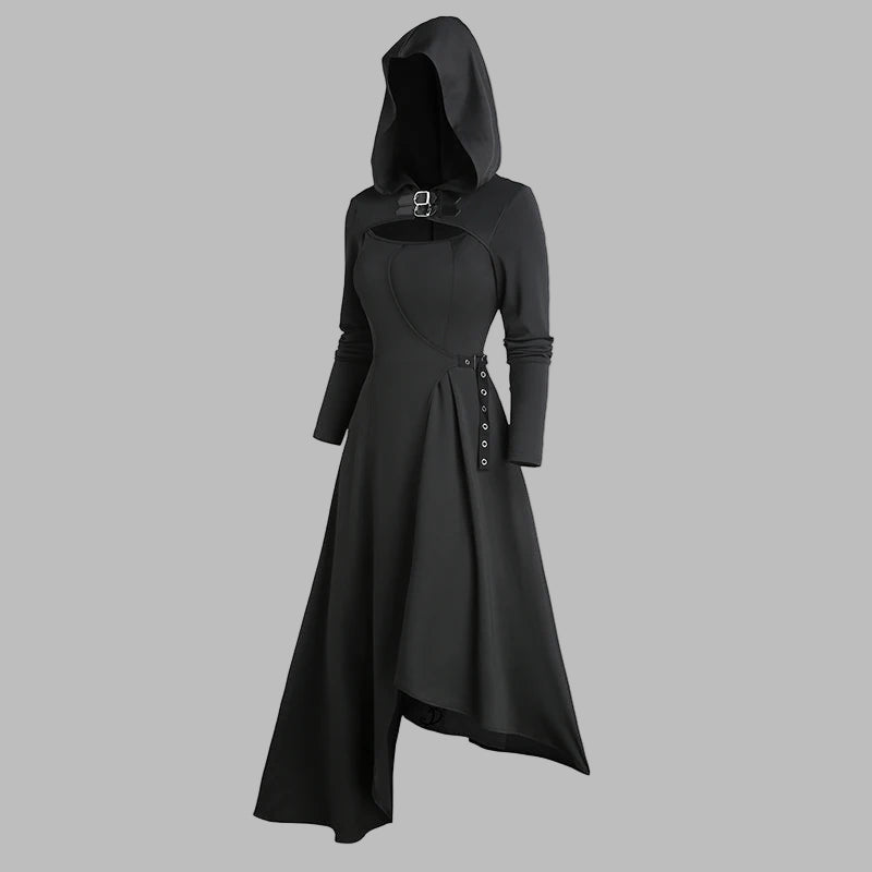 Asymmetrischer langer schwarzer Mantel mit Kapuze und Gürtel