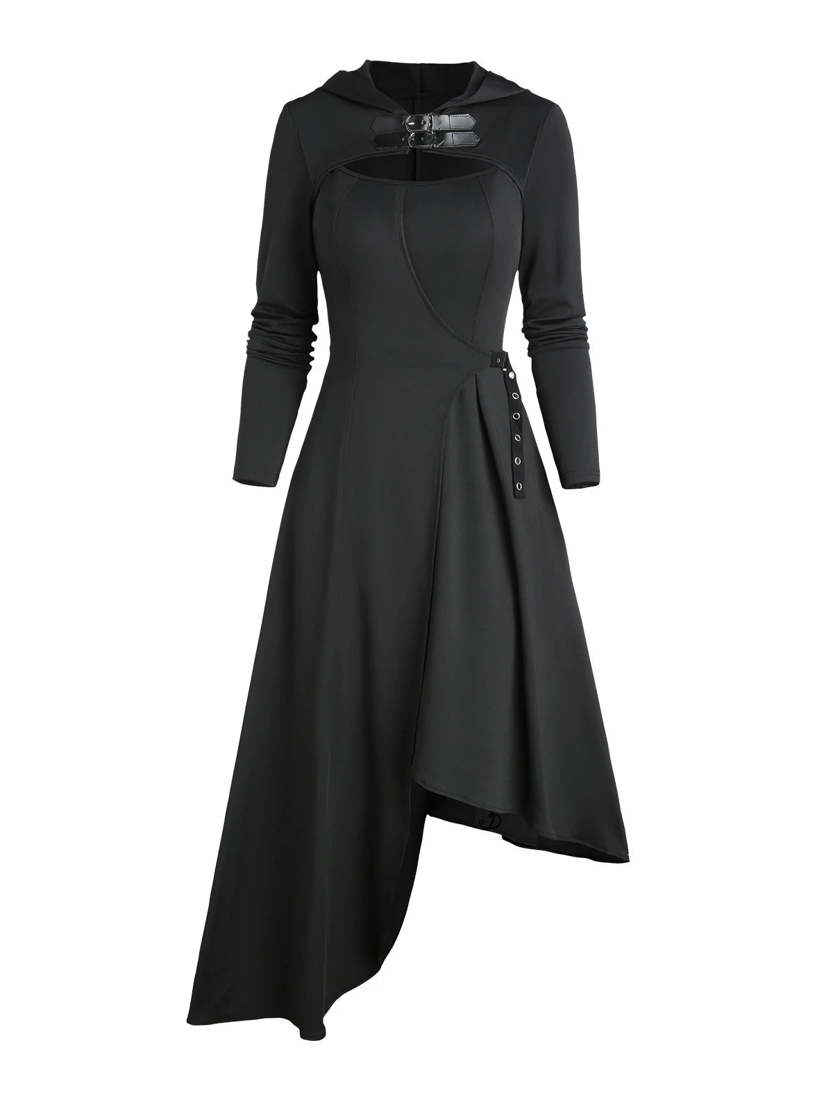 Schwarzer asymmetrischer langer Mantel mit Kapuze und Gürtel