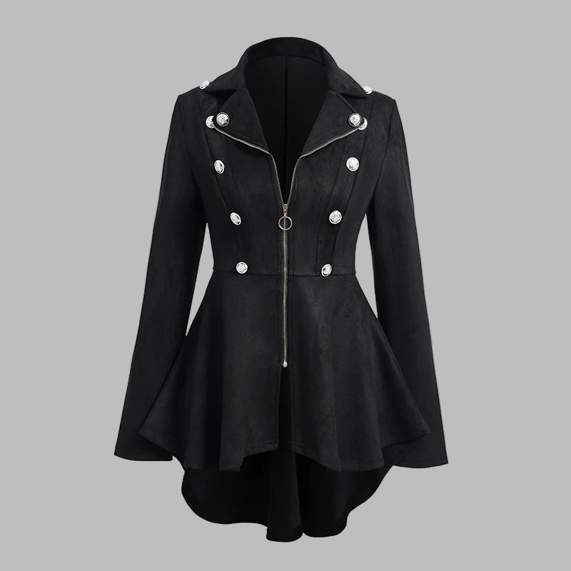 Schwarzer Damen-Gothic-Mantel ausgestellt, mit Knöpfen und Reißverschluss