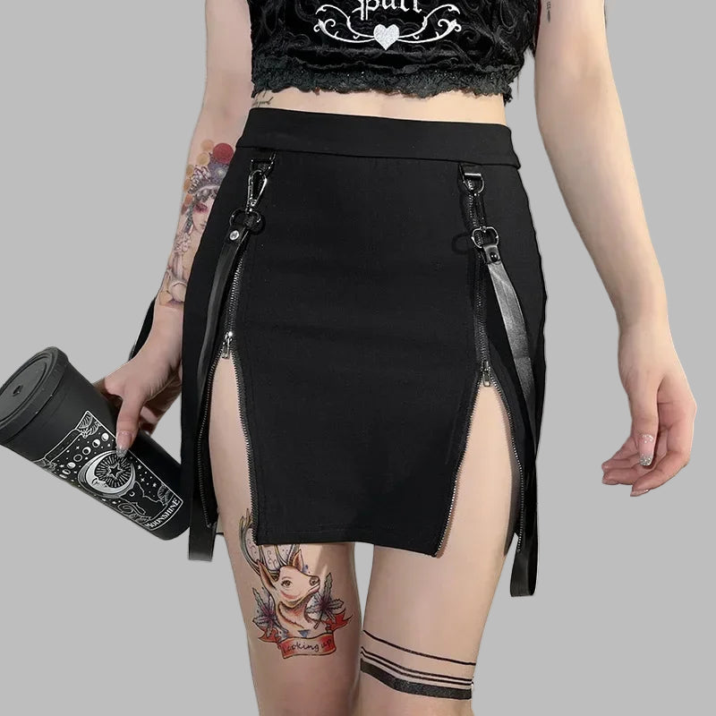 Schwarzer Gothic-Minirock mit Reißverschlüssen und Strap-Bändern