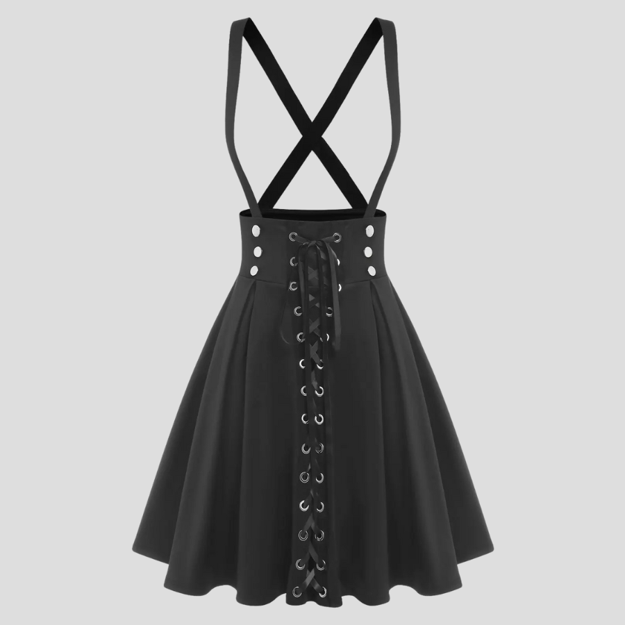 Schwarzer Metalgurtrock mit Hosenträgern und Korsettschnürung