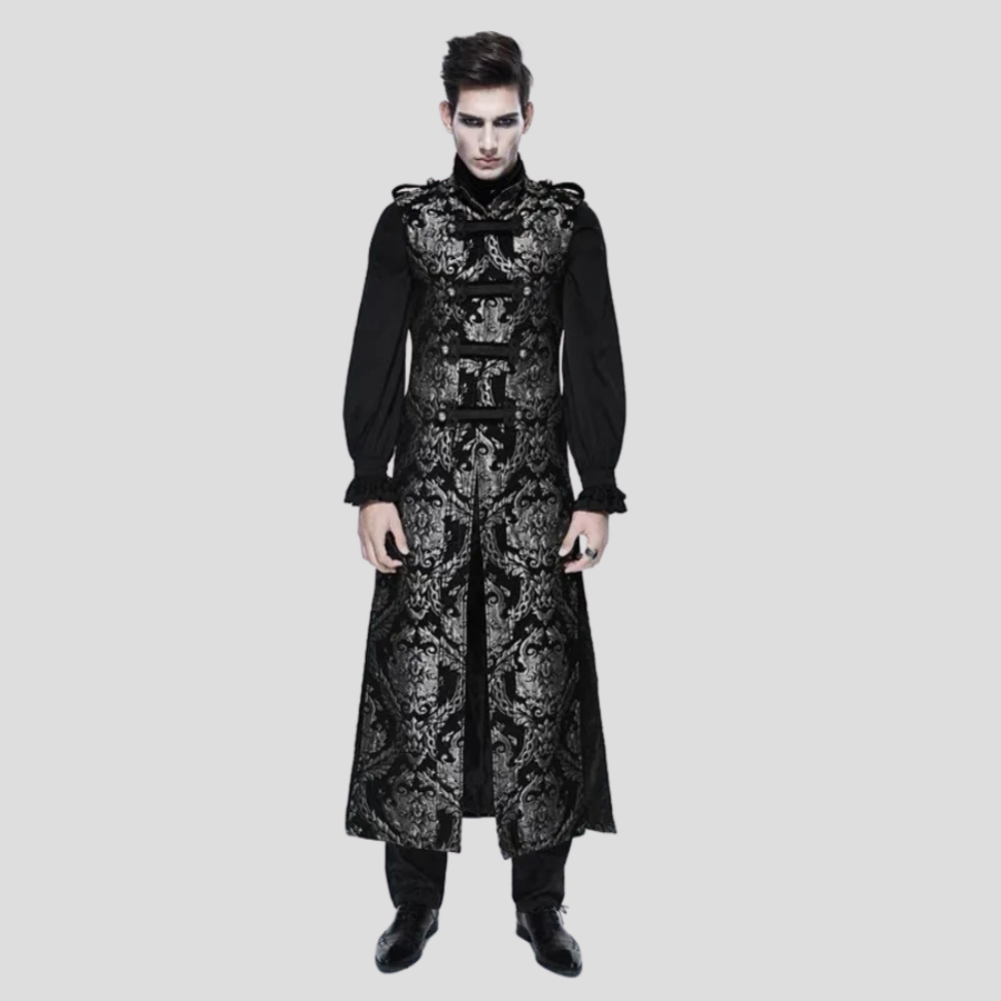 Schwarzer Steampunk-Gothic-Mantel mit Brokatmuster und Riemen