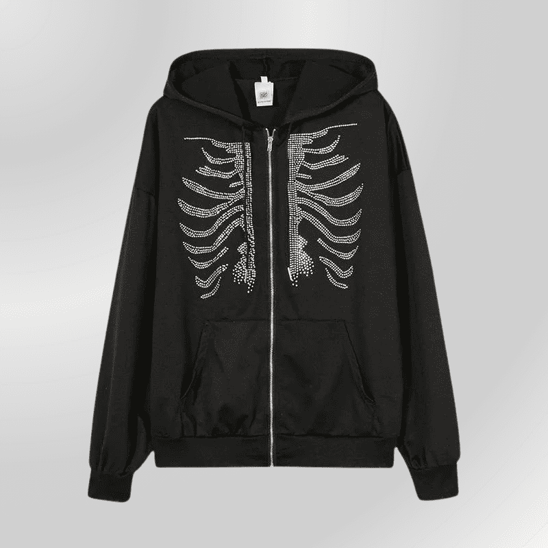 Schwarzes Gothic-Kapuzenpullover mit Skelettmuster