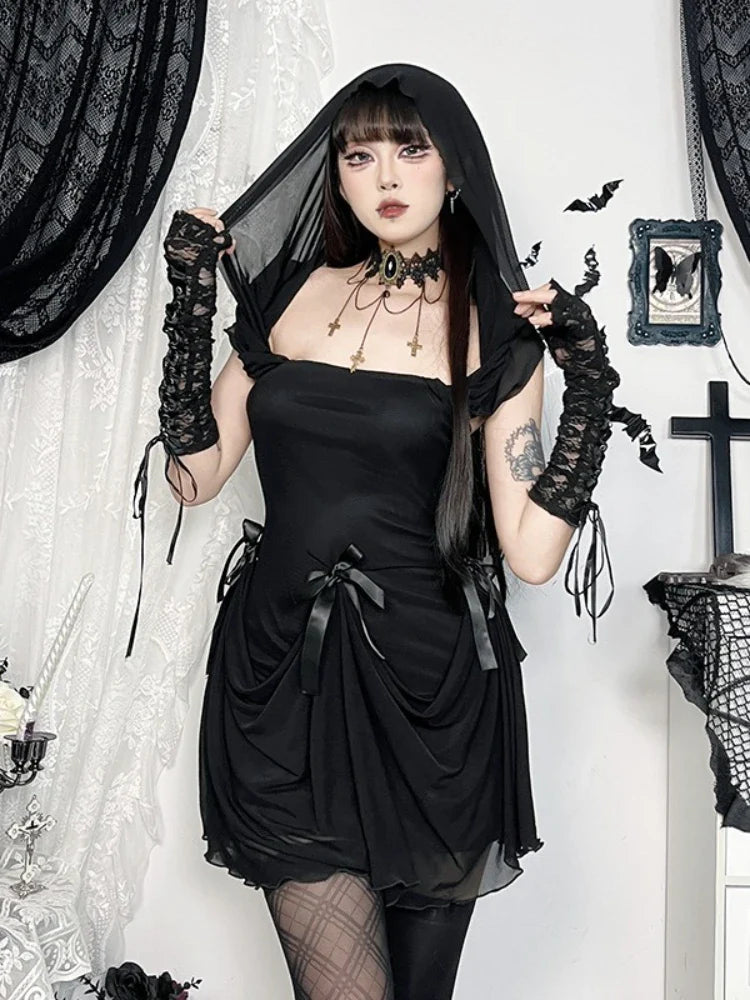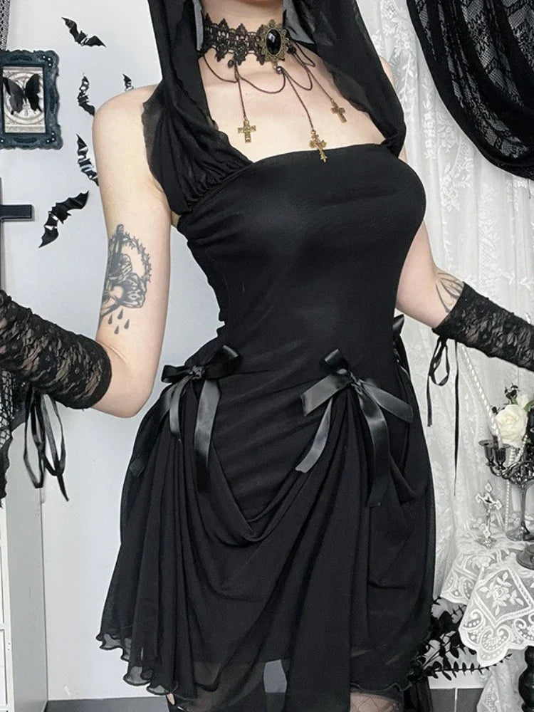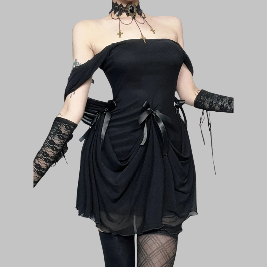 Schwarzes Grunge-Kleid mit langen Ärmeln und drapiertem Rock