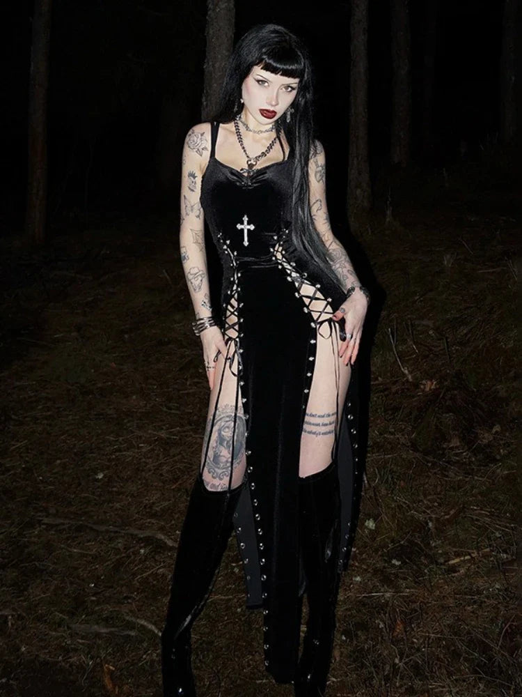 Schwarzes Grunge-Punk-Kleid mit Schlitz, Kreuz und Netz
