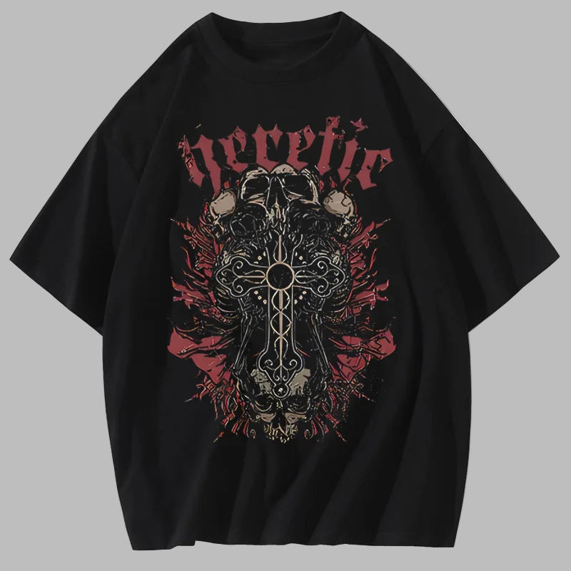 Schwarzes Metal-T-Shirt mit Kreuz und Totenköpfen