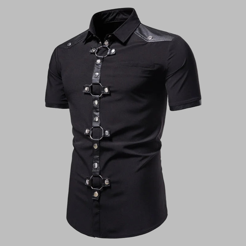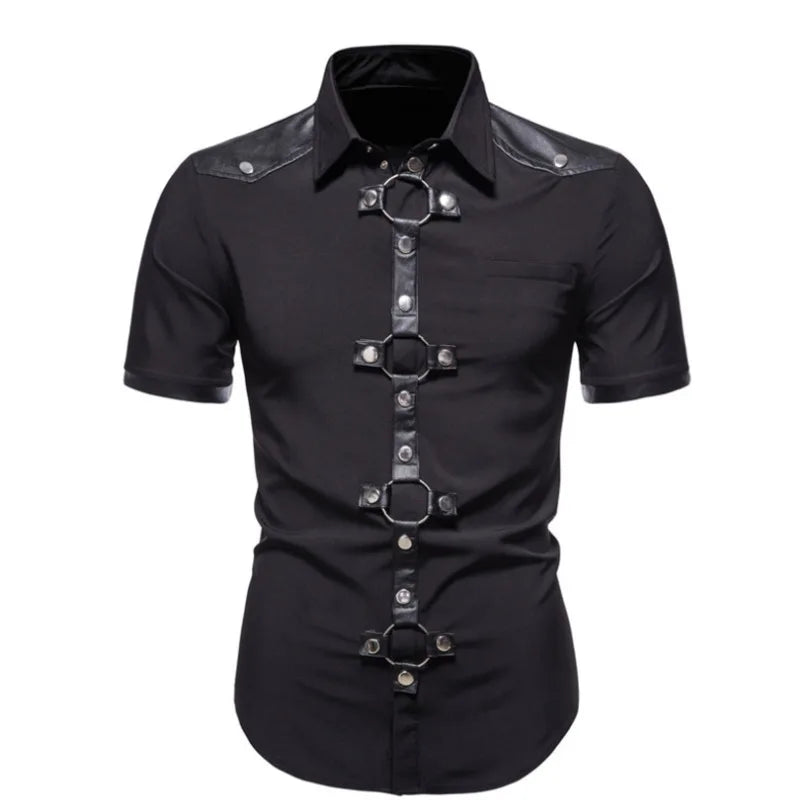 Schwarzes Punk-Hemd mit Metallringen und Bändern, Kurzarm